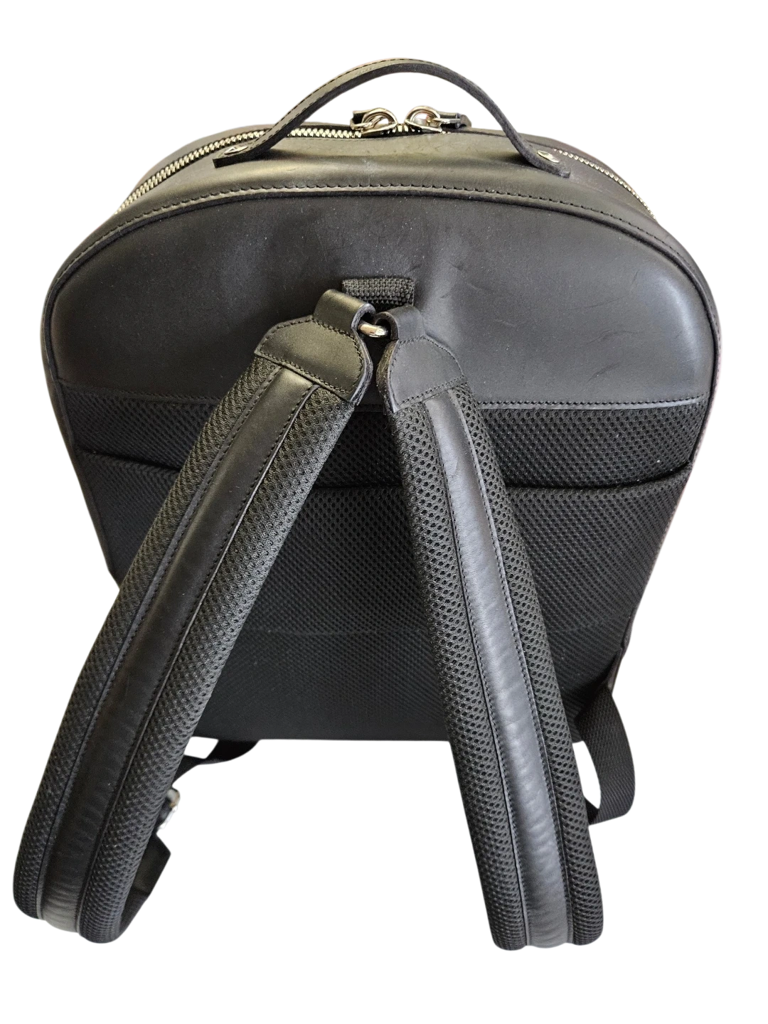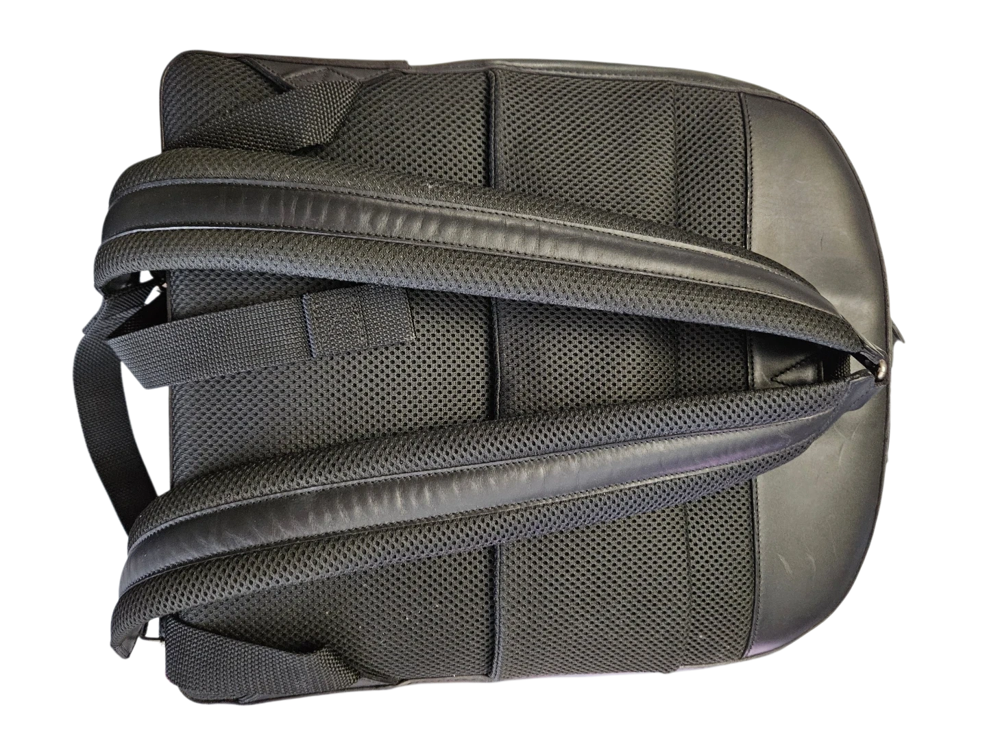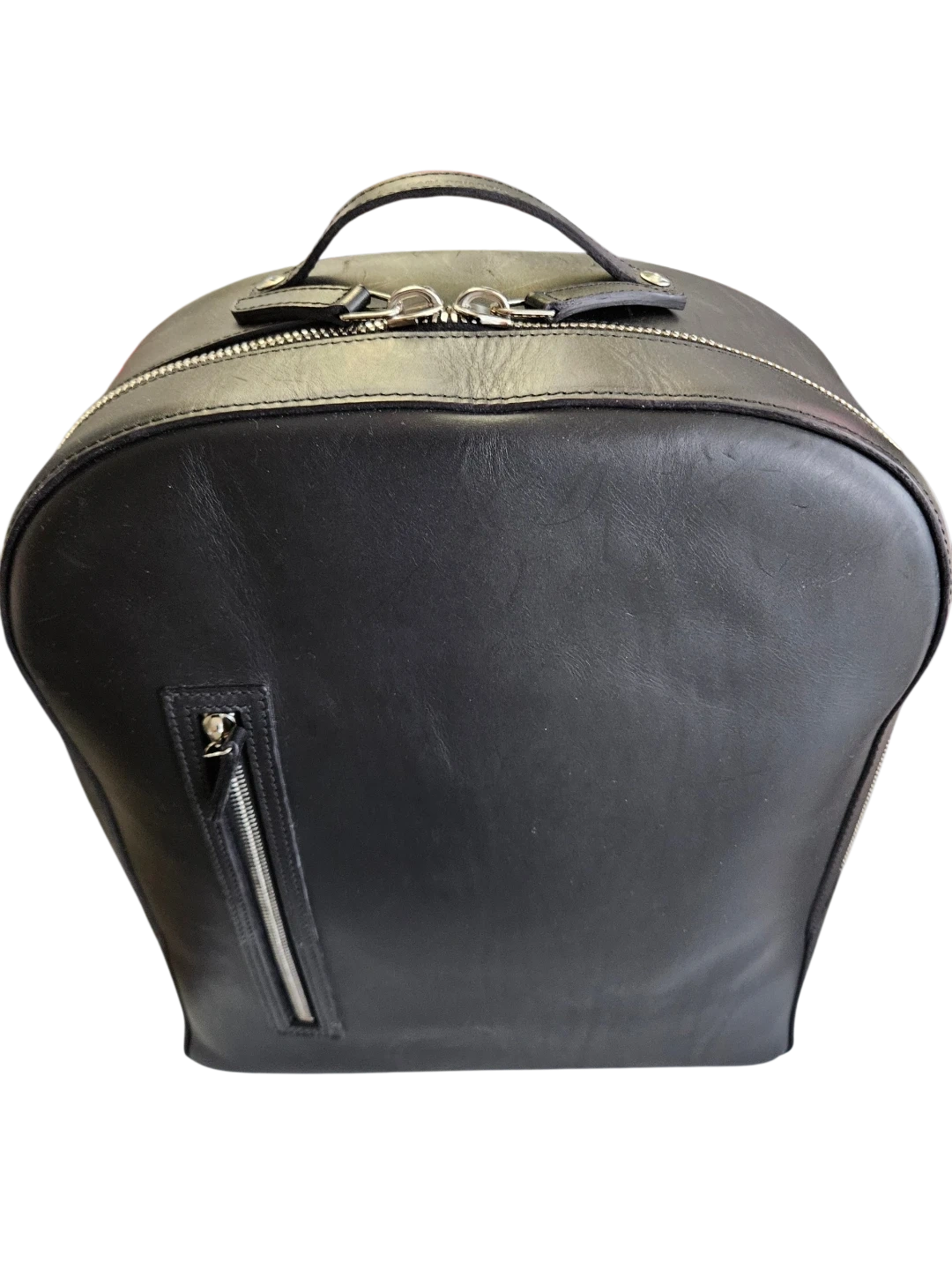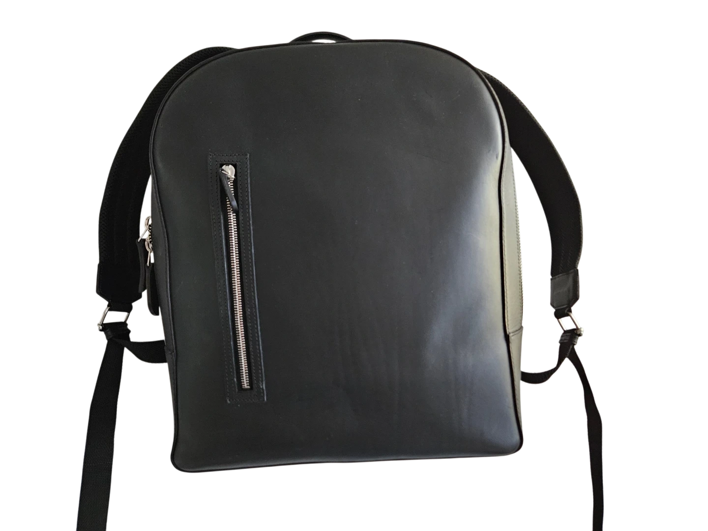 This black leather backpack is sleek and functional. It features padded shoulder straps for comfort and a zippered front pocket for easy access. Its leather construction makes it durable and stylish.