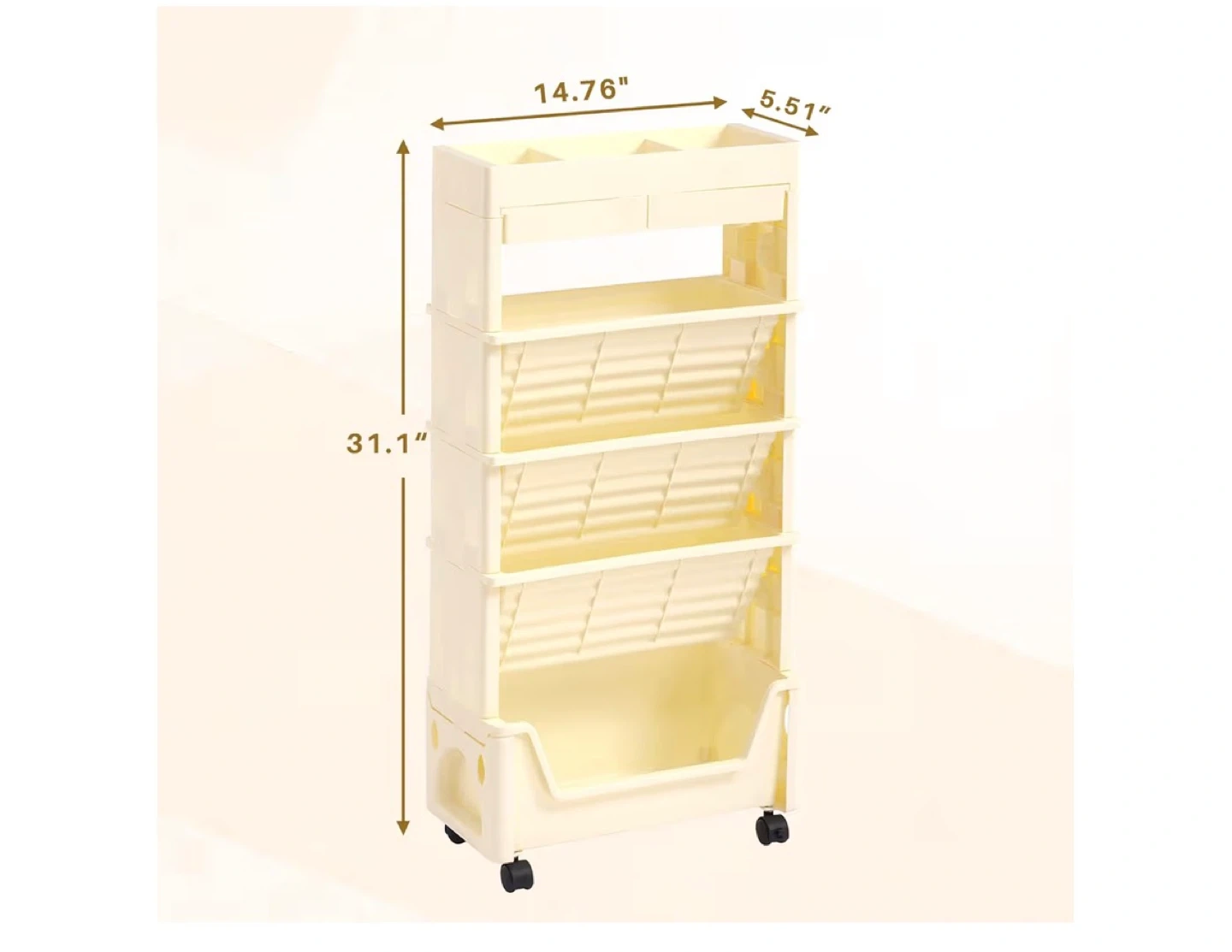 This cream plastic rolling storage cart has five drawers, perfect for organizing magazines, crafts, or office supplies. It's lightweight and comes with wheels for easy movement. Dimensions are 31.1" tall, 14.76" wide, and 5.51" deep. This cart is great for small spaces or anywhere extra storage is needed!