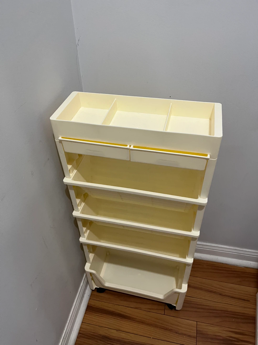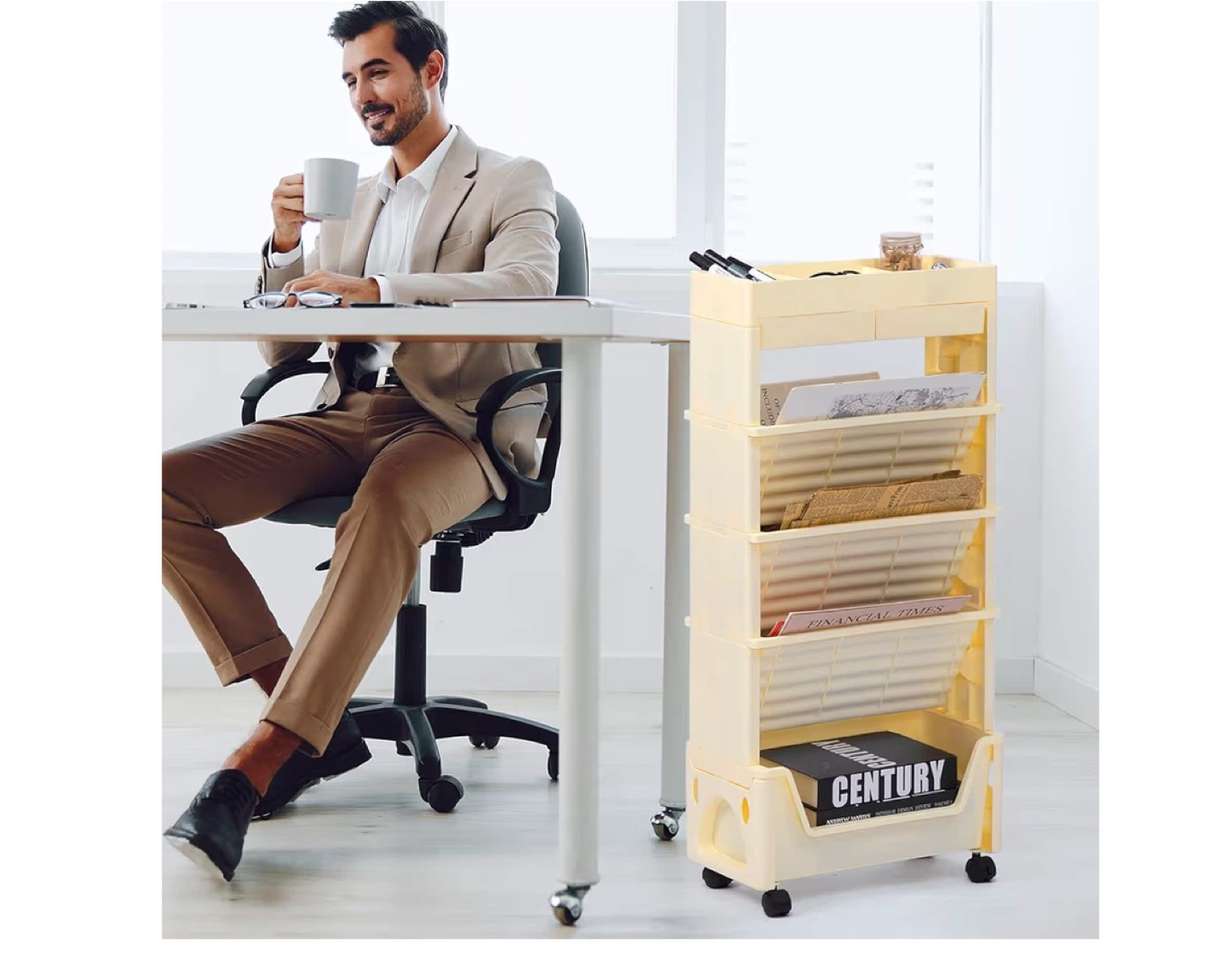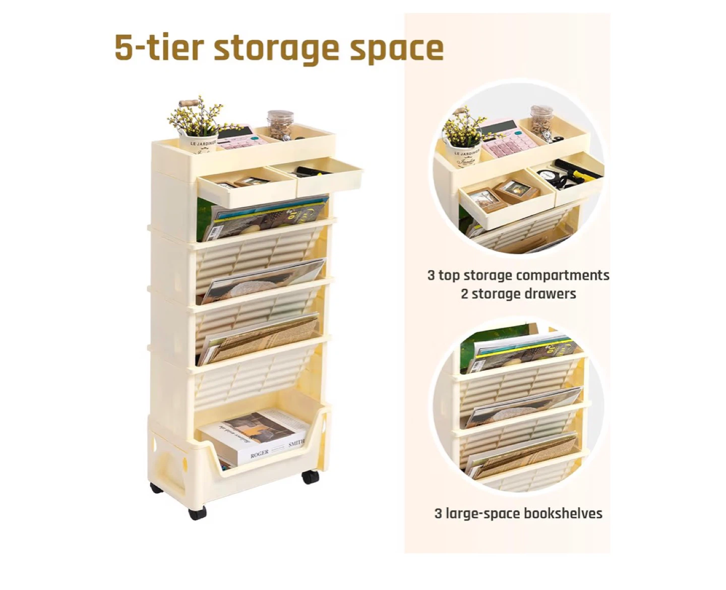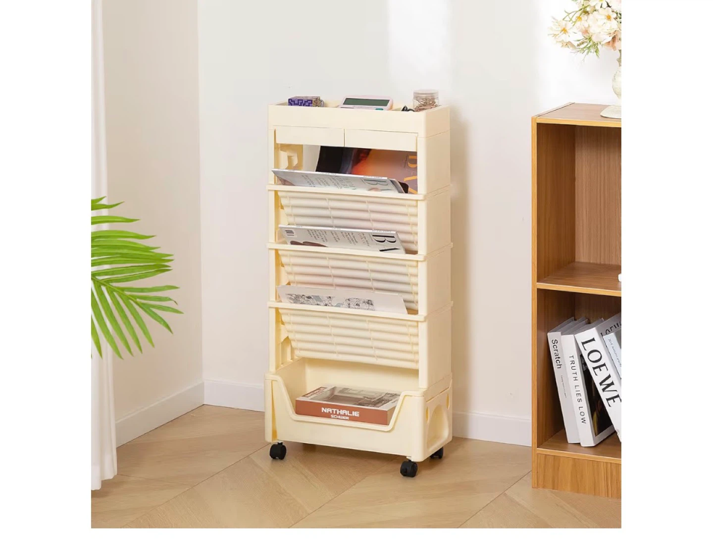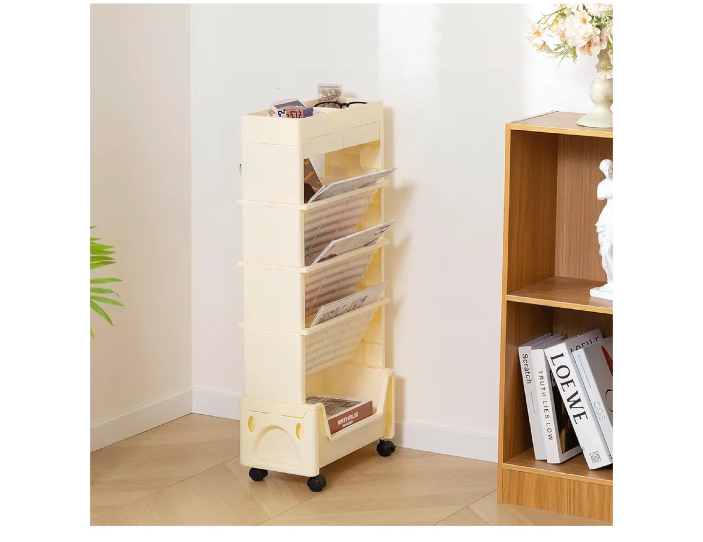 This cream plastic rolling storage cart has five drawers, perfect for organizing magazines, crafts, or office supplies. It's lightweight and comes with wheels for easy movement. Dimensions are 31.1" tall, 14.76" wide, and 5.51" deep. This cart is great for small spaces or anywhere extra storage is needed!