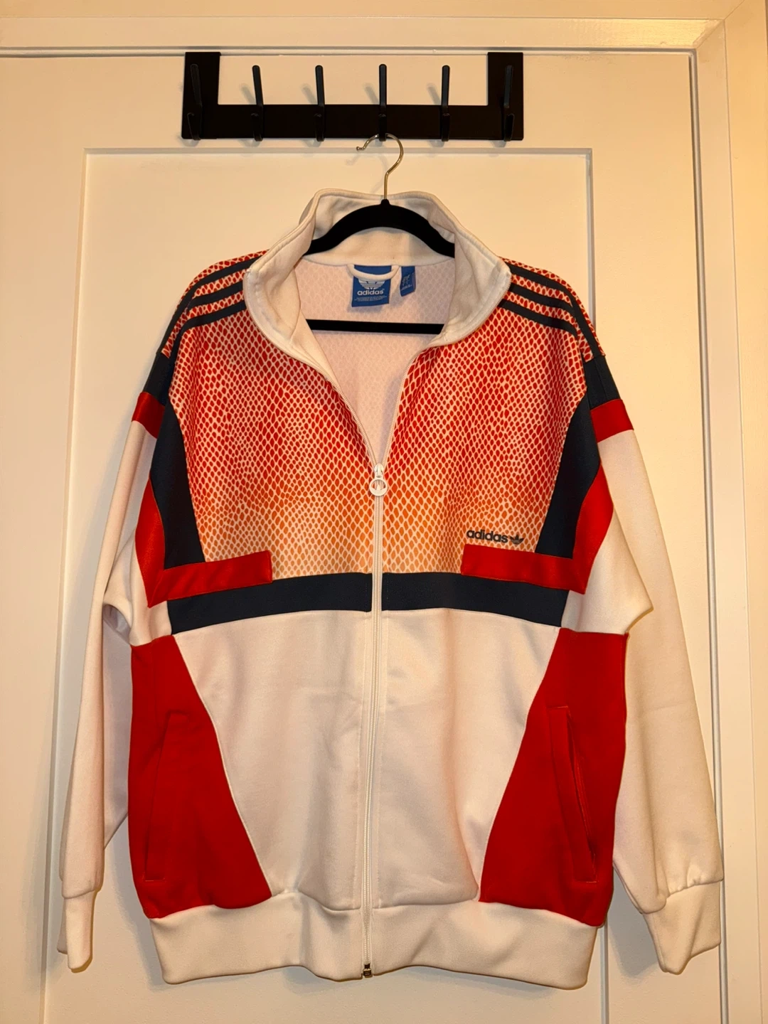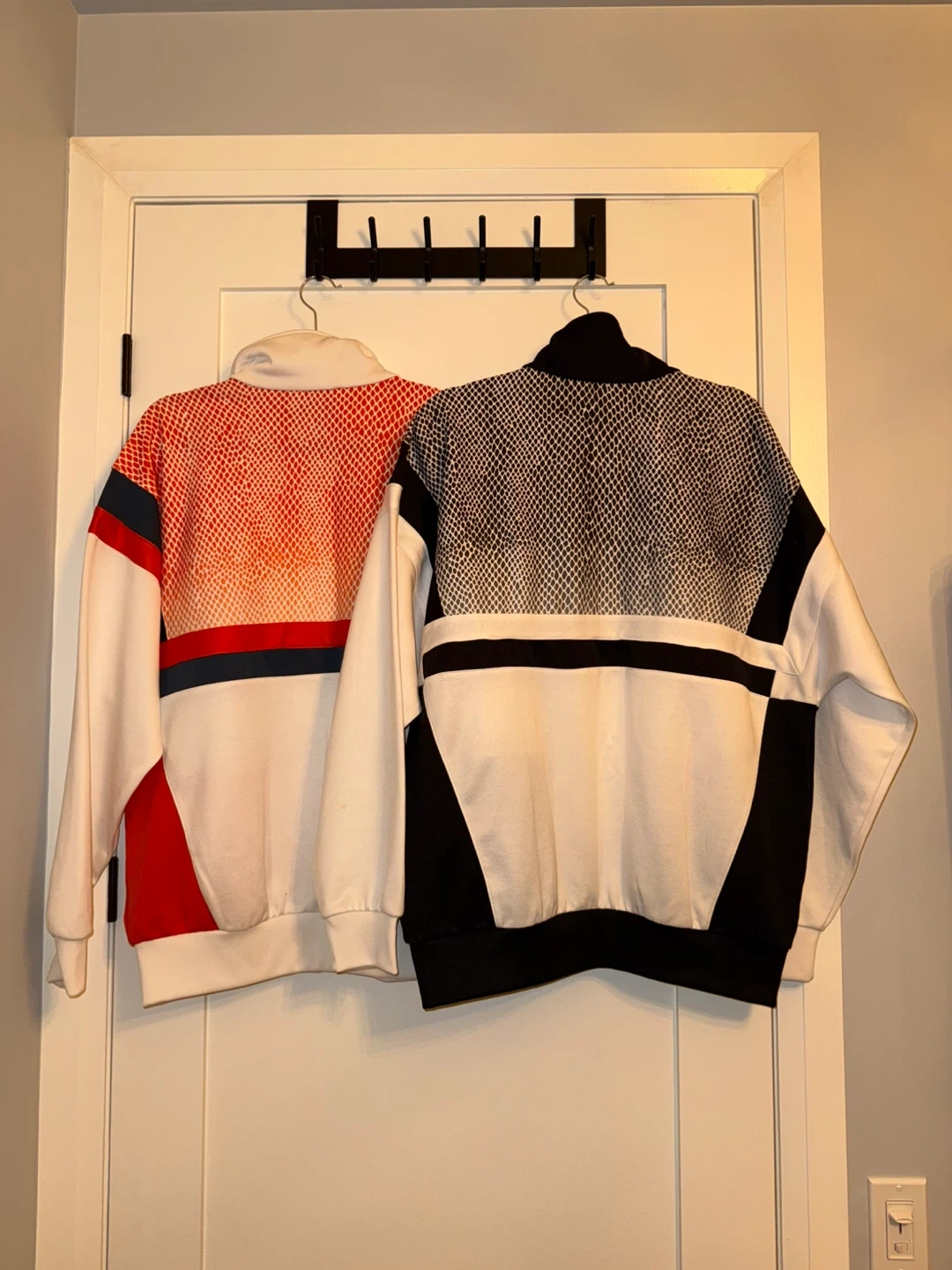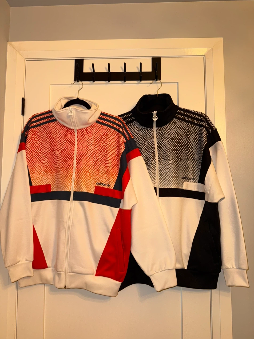 Adidas track jacket in size L. One is black and white, the other is orange, white, and black. Both are in great condition!
