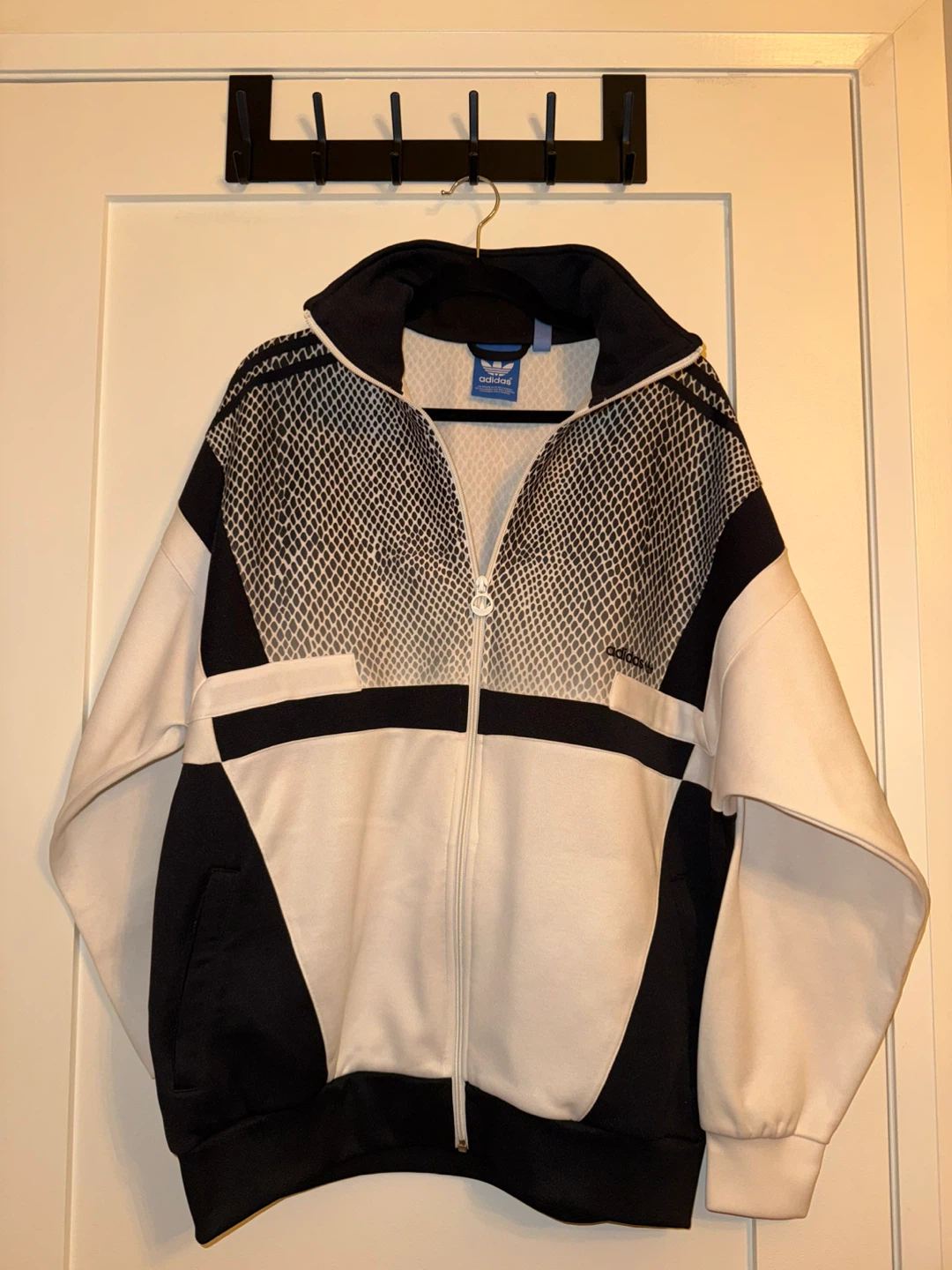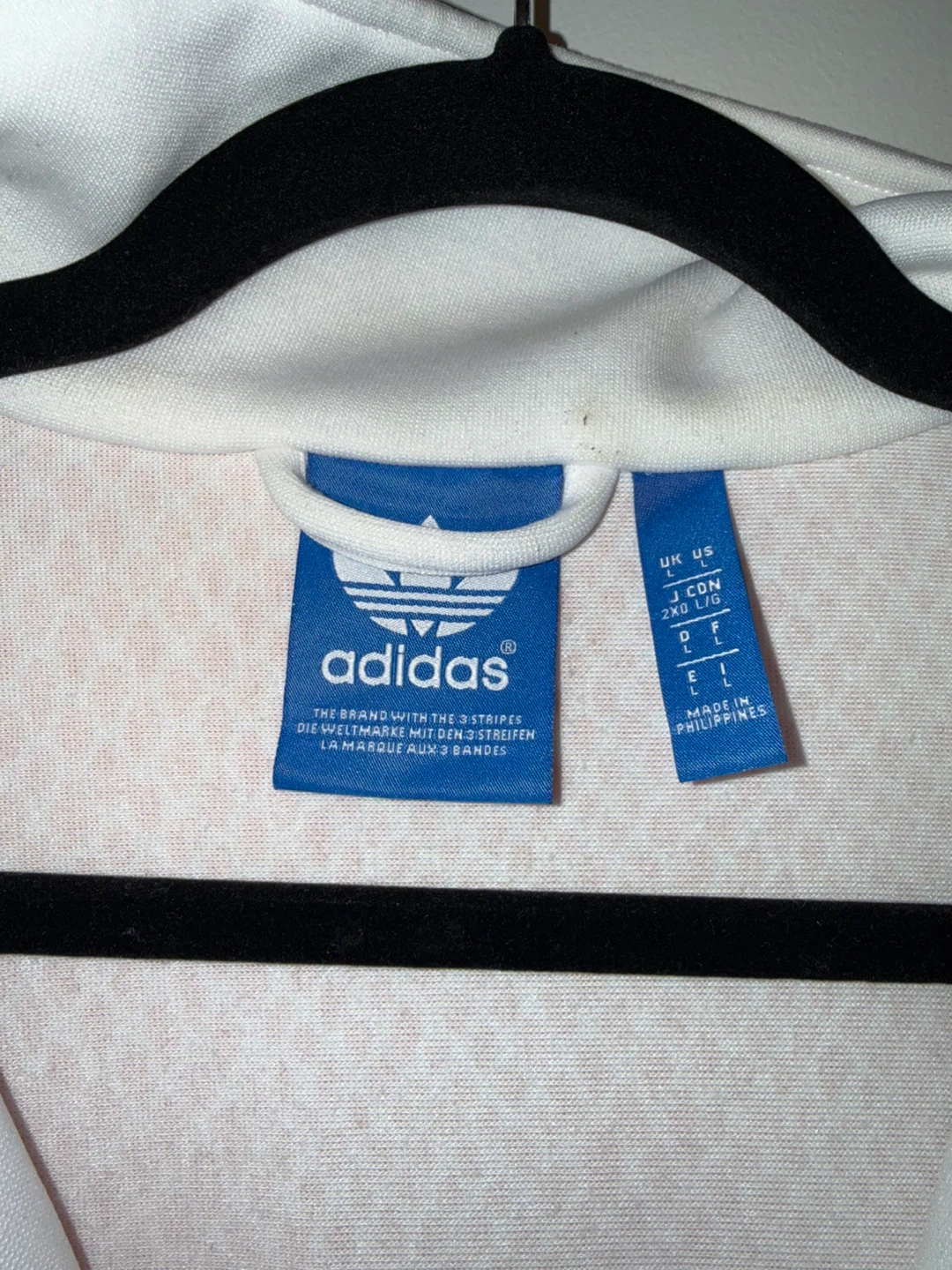 Adidas track jacket in size L. One is black and white, the other is orange, white, and black. Both are in great condition!