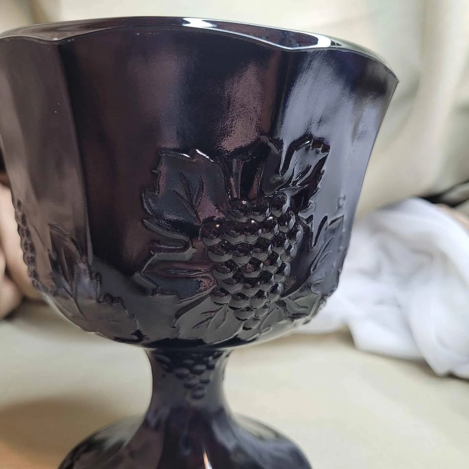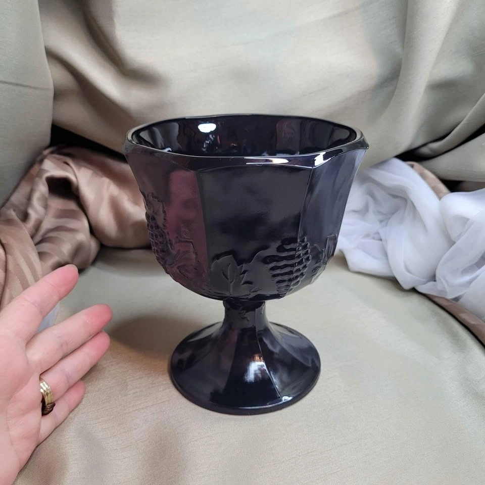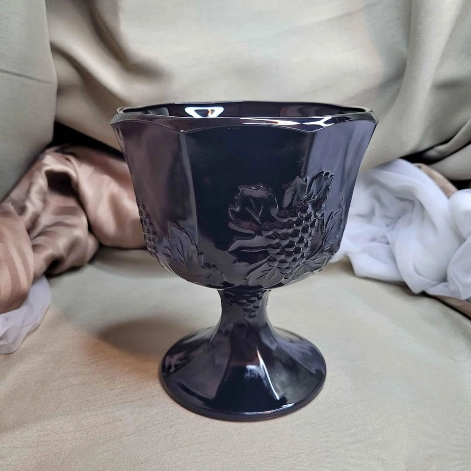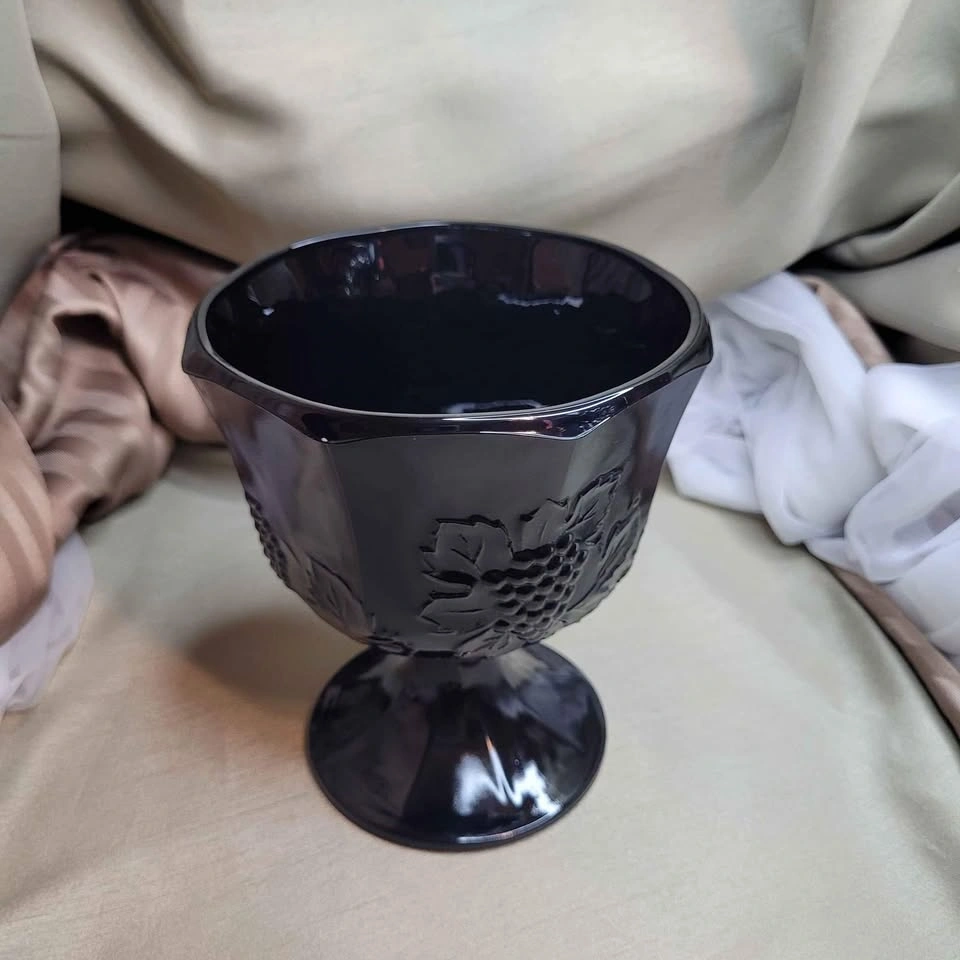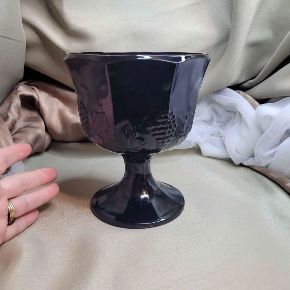 Beautiful Vintage 6 1/2" x 5 1/2" Black Glass Pedestal Foot Vase with Grape Detail. Excellent condition. Please see all pictures. See all my other listings for bundle deals. Located in Bradford. May be able to meet. Please contact me for more info and to make arrangements. Thank you for looking!