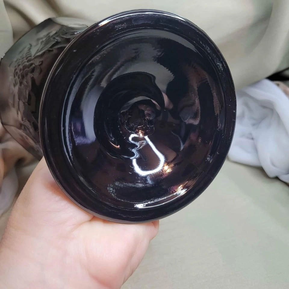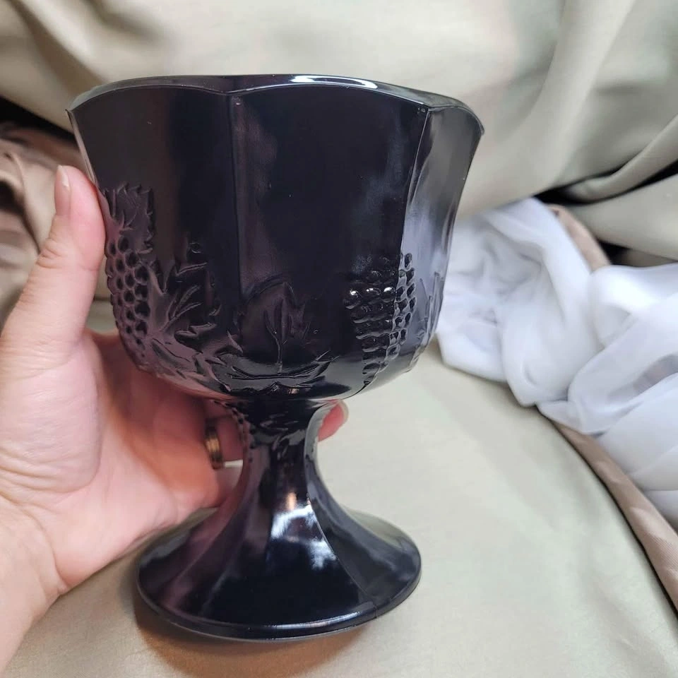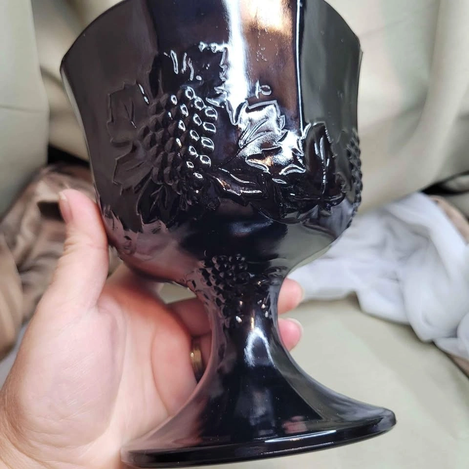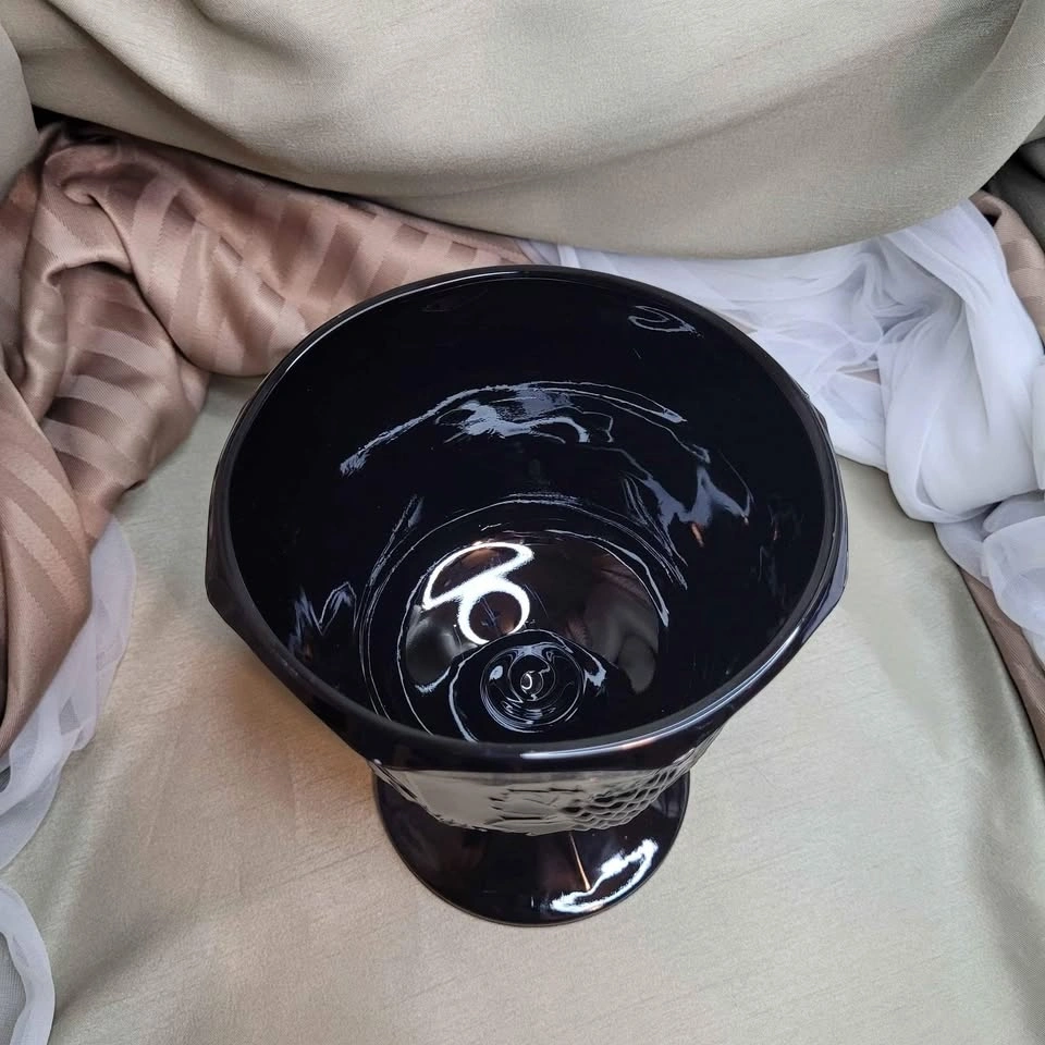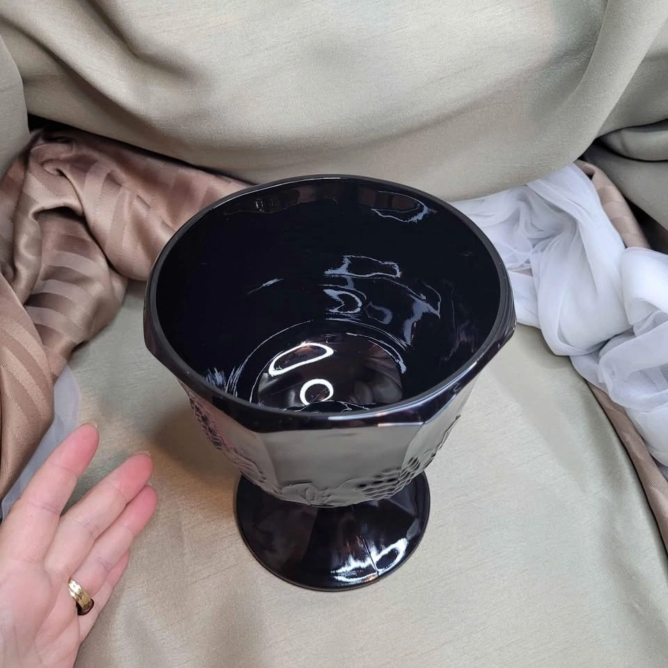 Beautiful Vintage 6 1/2" x 5 1/2" Black Glass Pedestal Foot Vase with Grape Detail. Excellent condition. Please see all pictures. See all my other listings for bundle deals. Located in Bradford. May be able to meet. Please contact me for more info and to make arrangements. Thank you for looking!