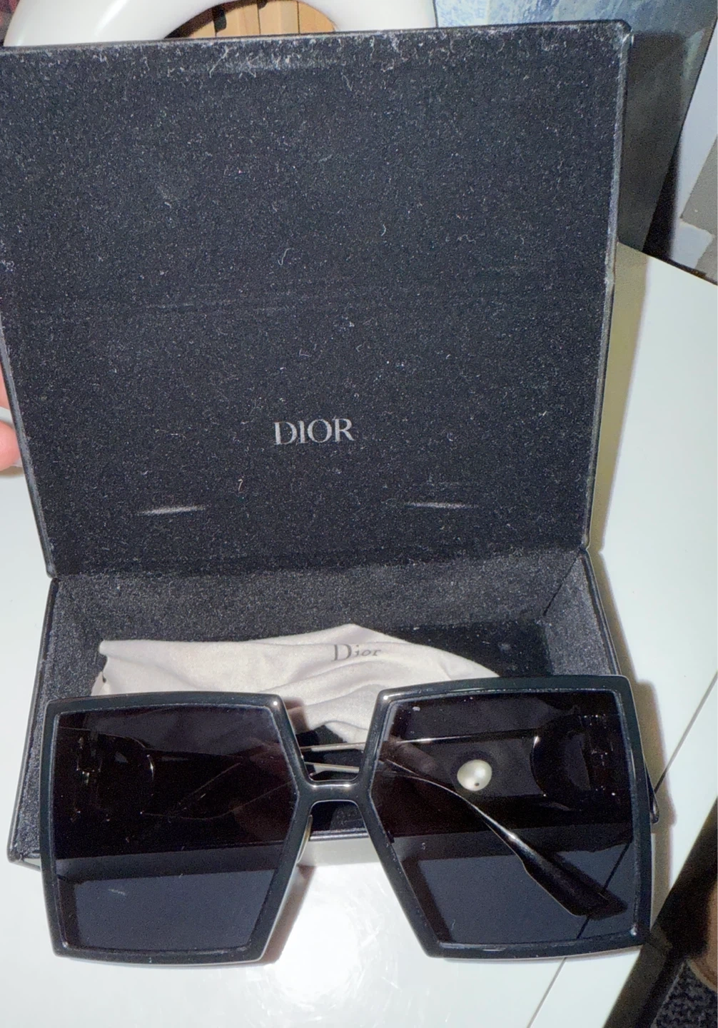 Selling a pair of Dior sunglasses in black. They come with the original Dior case. The sunglasses have a stylish design with the Dior logo on the side. Great condition!