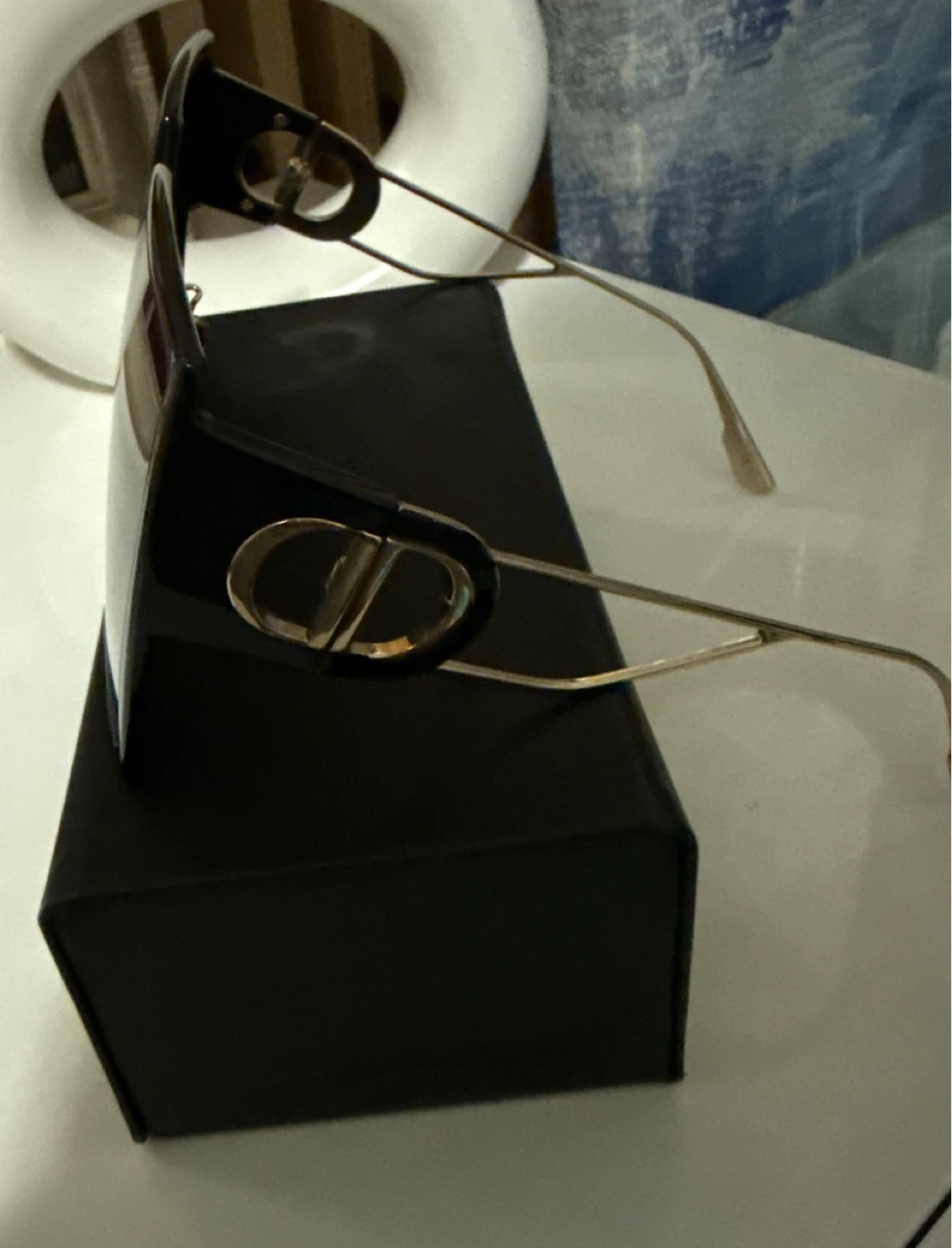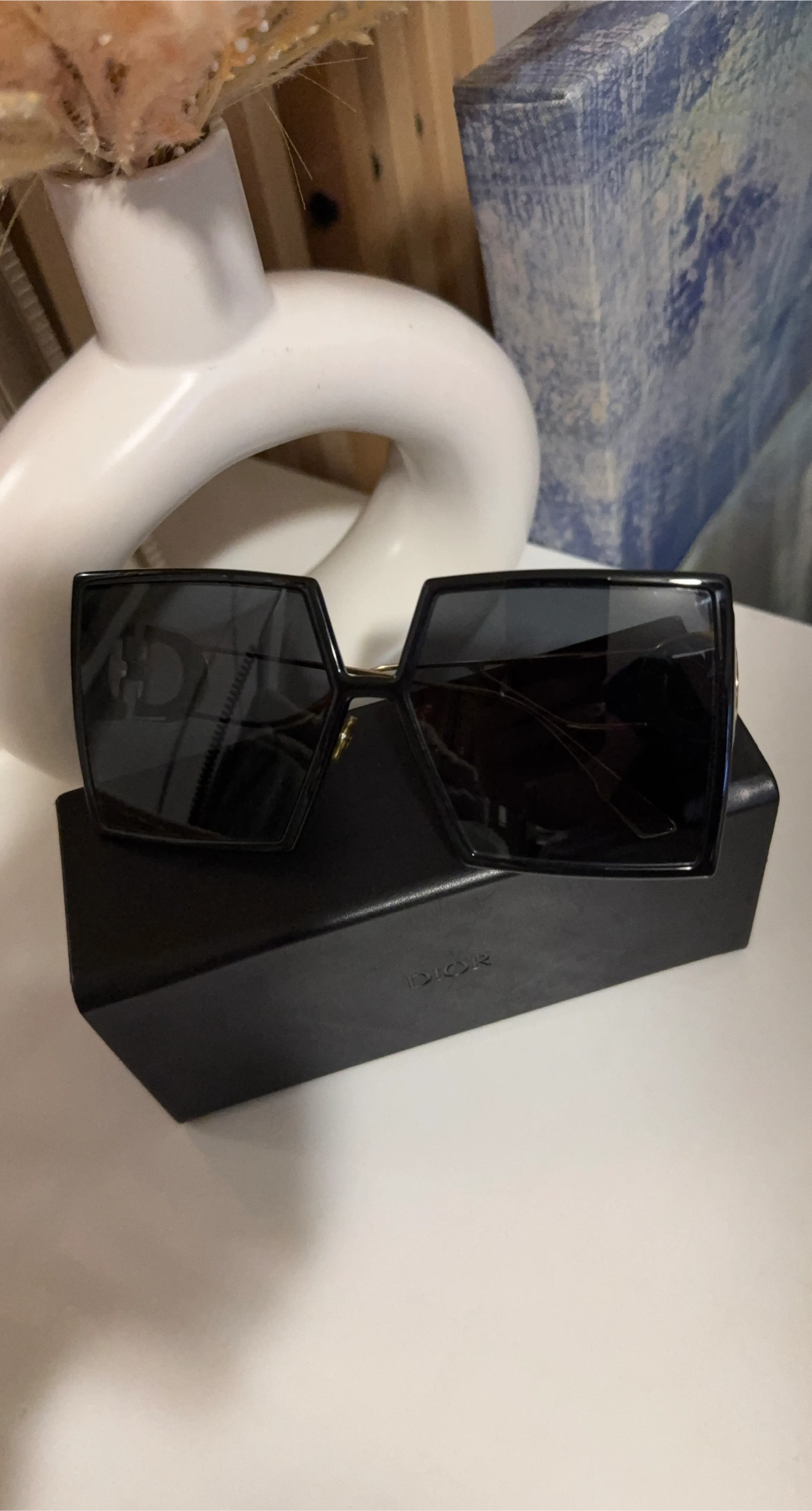 Selling a pair of Dior sunglasses in black. They come with the original Dior case. The sunglasses have a stylish design with the Dior logo on the side. Great condition!
