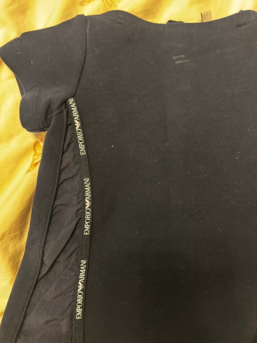 This black t-shirt dress features iconic Emporio Armani logo tape along the sides. It's a short-sleeved style with a comfortable fit. Perfect for casual wear or dressing up!t