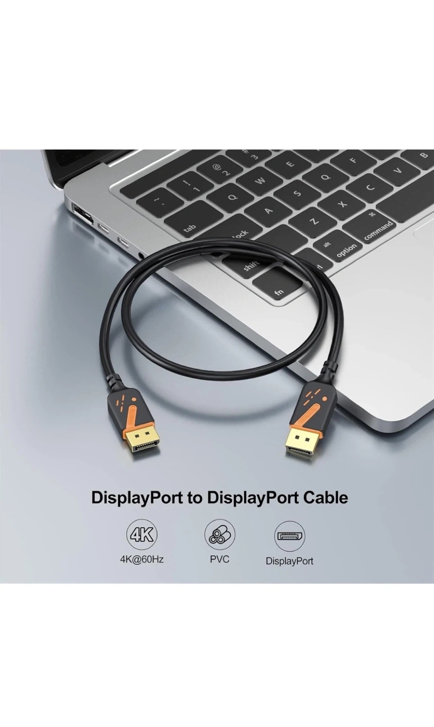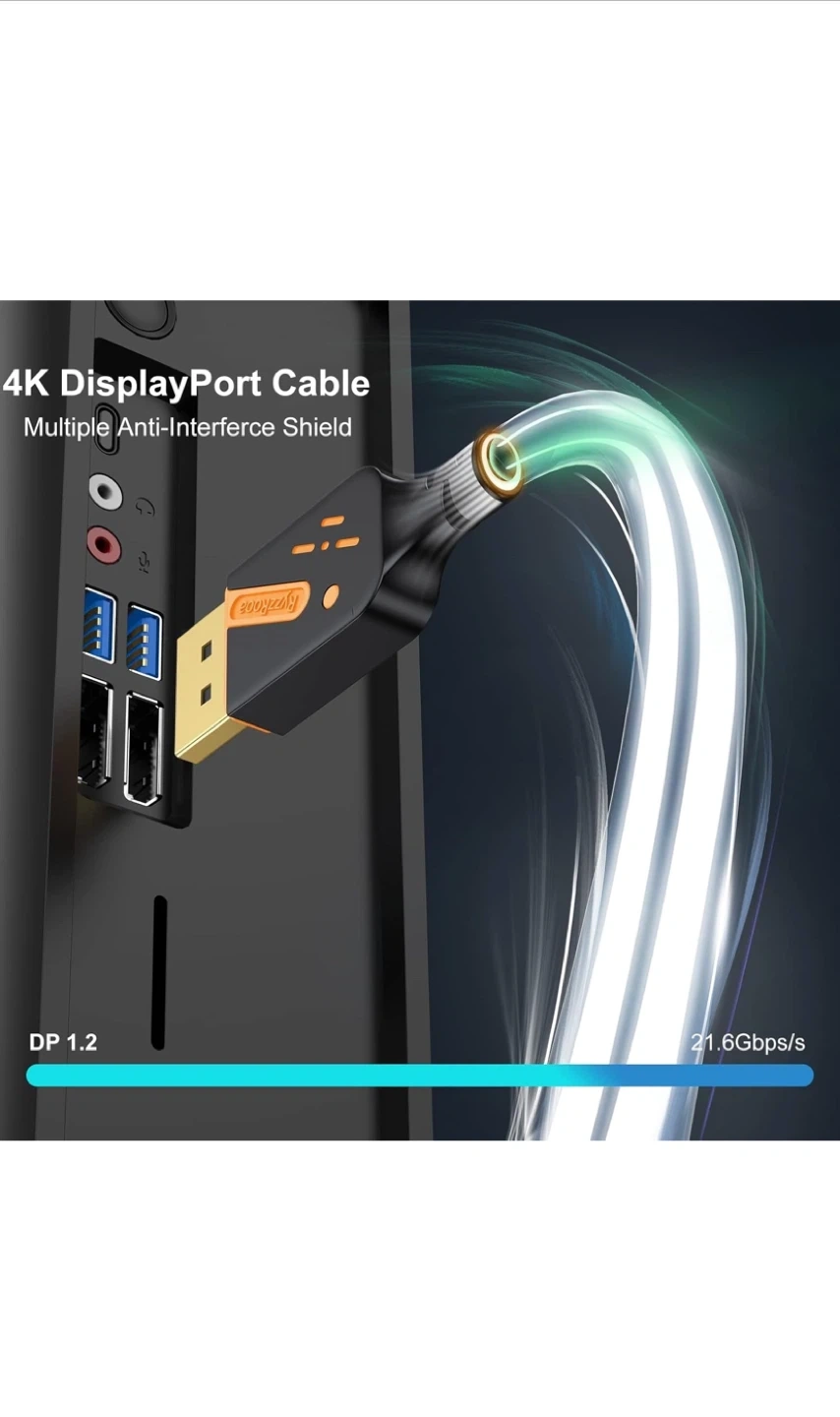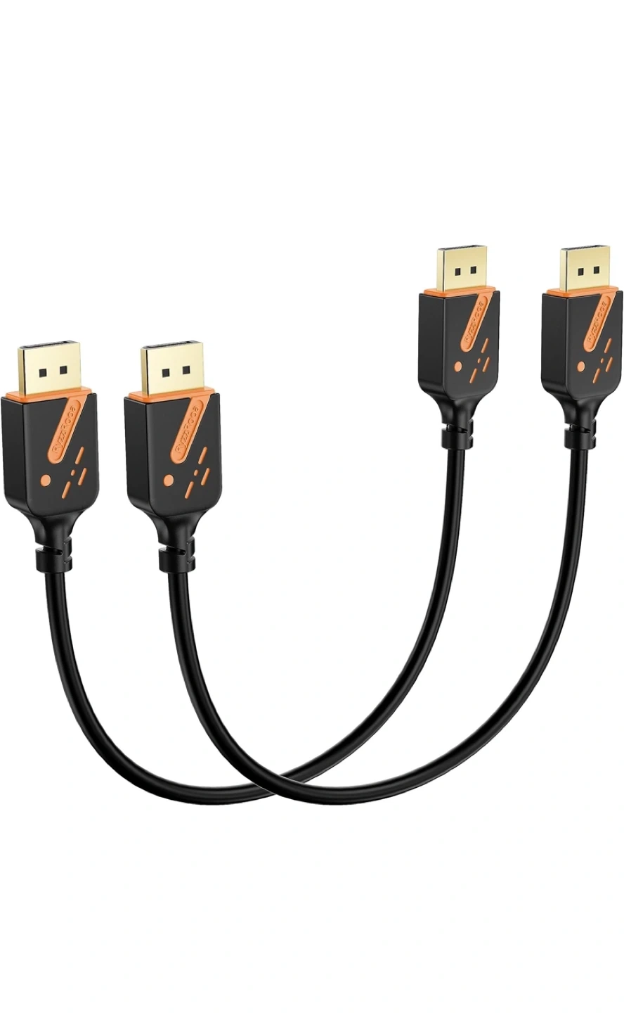 These are two black DisplayPort 1.2 cables. They support 4K resolution at 60Hz with a bandwidth of 21.6Gbps. Features gold-plated connectors for a secure connection. Perfect for connecting your monitor or display to a graphics card or computer!