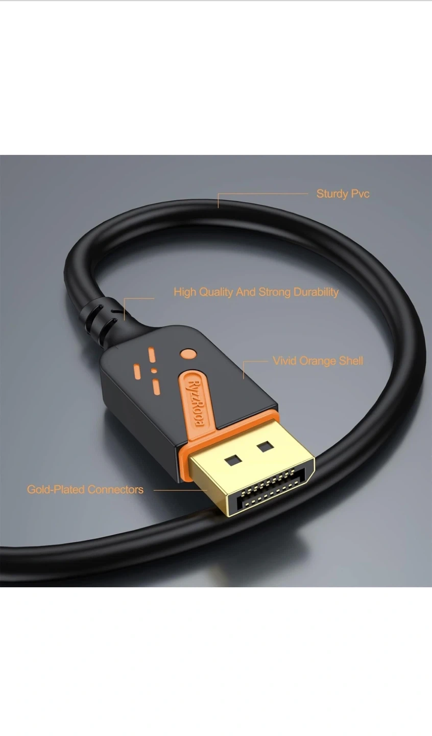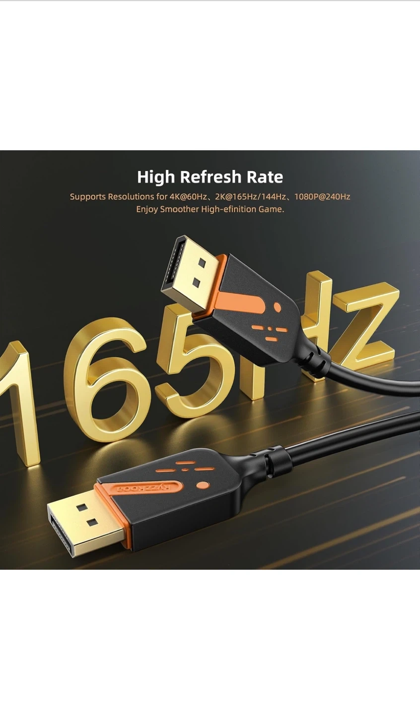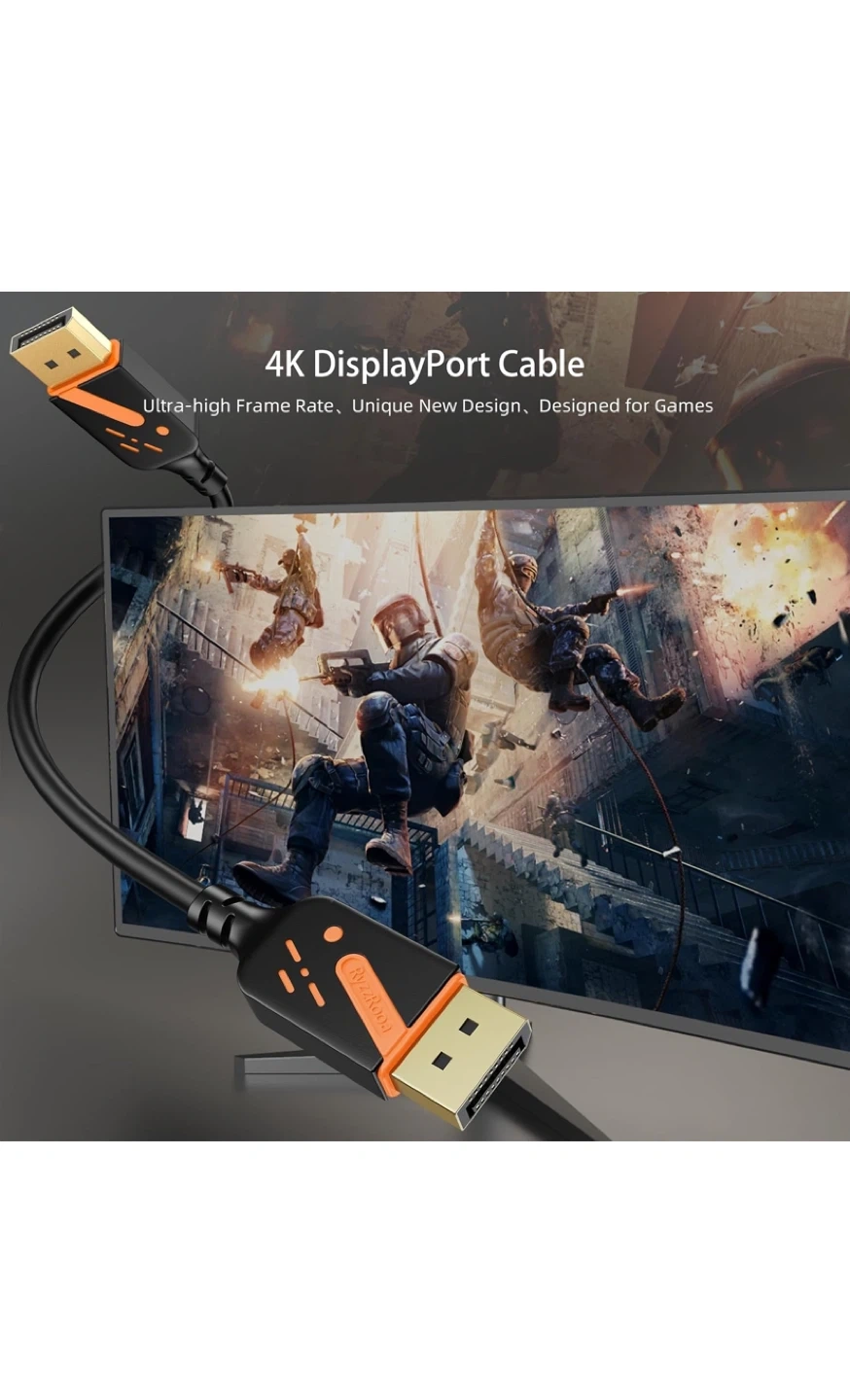 These are two black DisplayPort 1.2 cables. They support 4K resolution at 60Hz with a bandwidth of 21.6Gbps. Features gold-plated connectors for a secure connection. Perfect for connecting your monitor or display to a graphics card or computer!