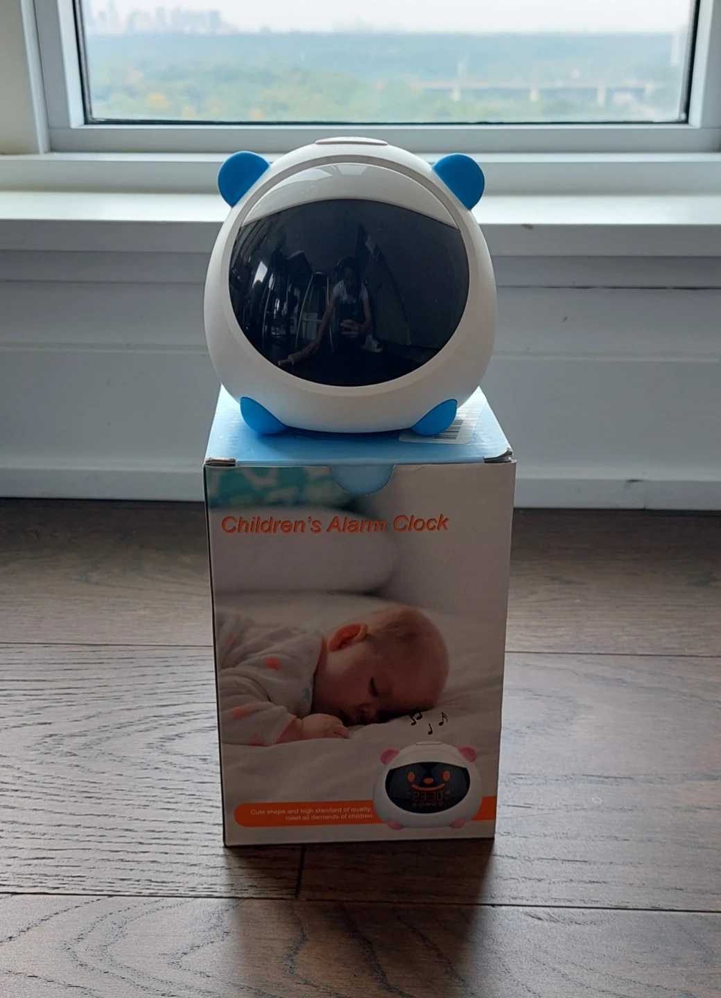 This is a cute children's alarm clock with a fun design. It's white with blue accents and a dark screen. The clock comes in its original box.