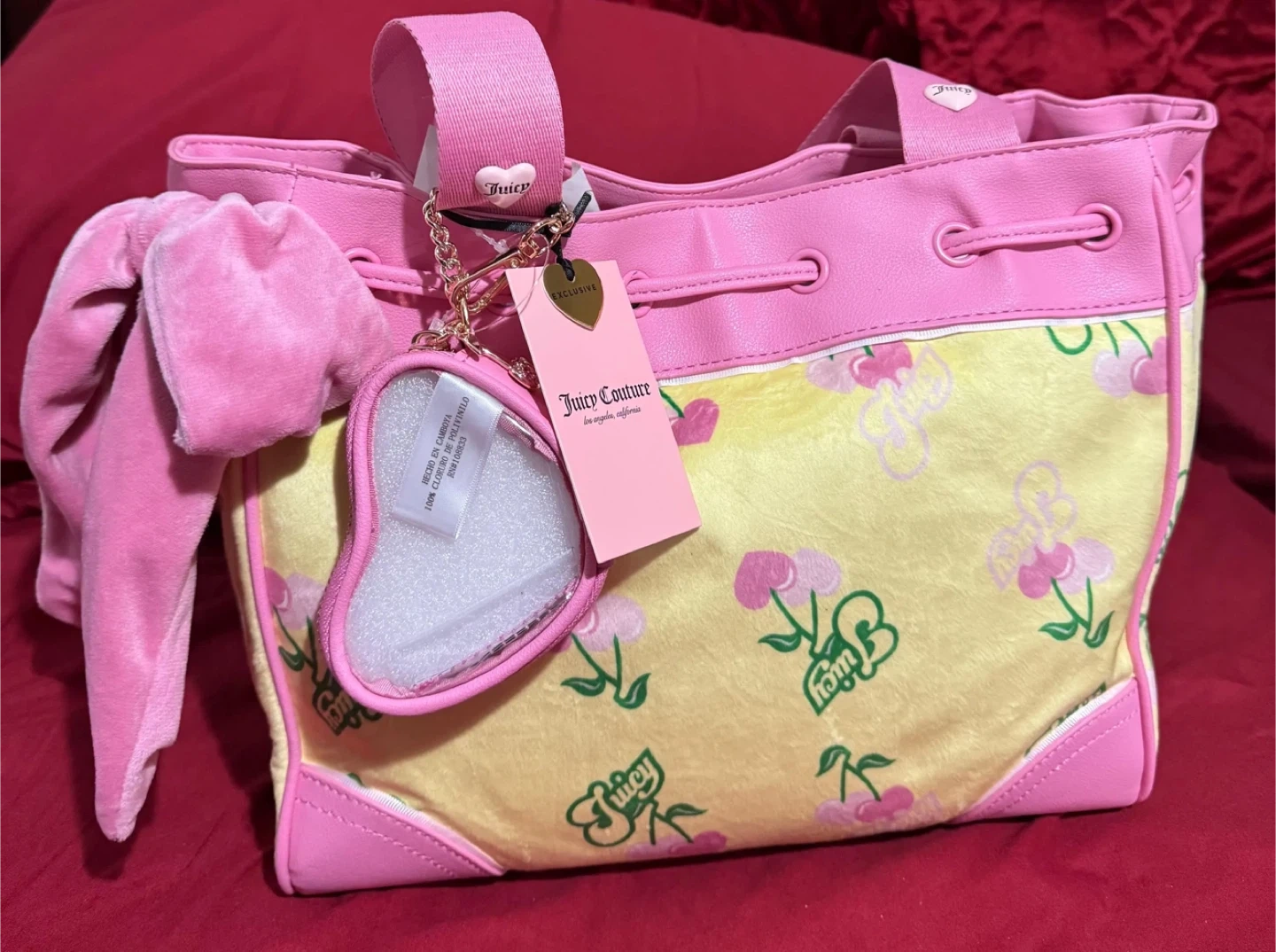 This Juicy Couture bucket bag features a fun yellow velour material with a pink cherry print.