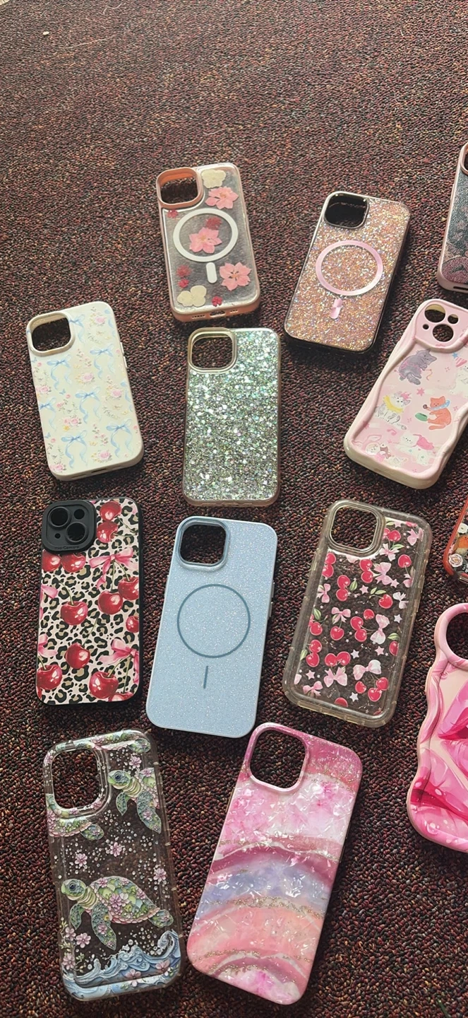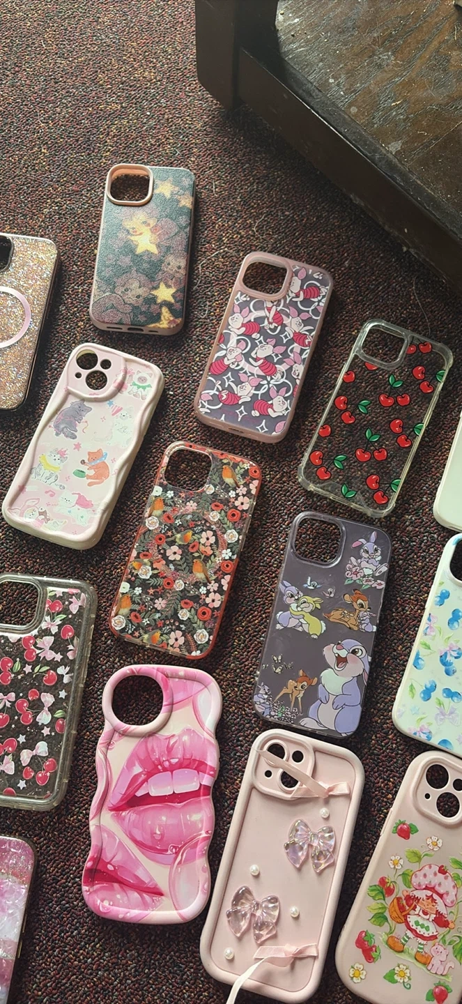 Collection of cute and fun iPhone cases featuring various designs like Strawberry Shortcake, cherries, butterflies, and lips. Most appear to be for standard iPhone models, offering protection and style. Some cases have glitter or pearl accents. Lots of variety to choose from! Selling all for 10$