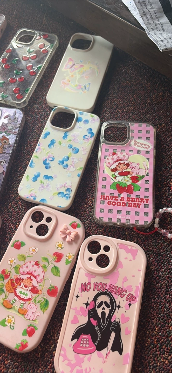Collection of cute and fun iPhone cases featuring various designs like Strawberry Shortcake, cherries, butterflies, and lips. Most appear to be for standard iPhone models, offering protection and style. Some cases have glitter or pearl accents. Lots of variety to choose from! Selling all for 10$