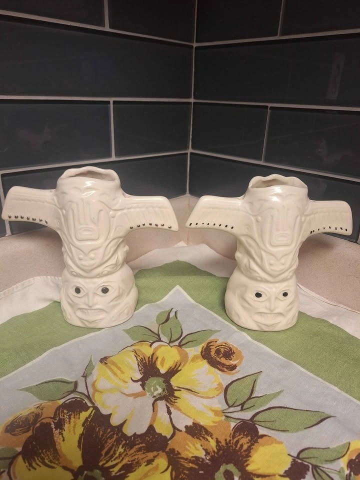 Two Tiki totem cocktail tumblers. These epic mid century beauties are hand painted and made in Canada. One from the Harrison Springs Hotel, the other from the Sheraton Villa Inn in Burnaby. A uniquely West Coast addition to your Tiki collection. $30 obo. Pickup in Steveston Village, Richmond.