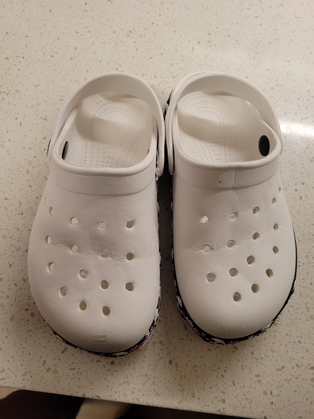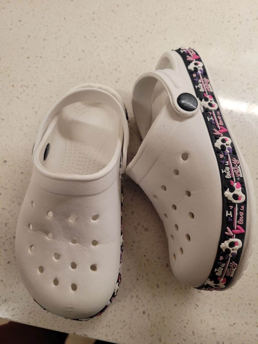 White Crocs clogs with a fun skull and heart pattern around the heel strap. These are comfortable and easy to slip on. Perfect for casual wear or around the house!