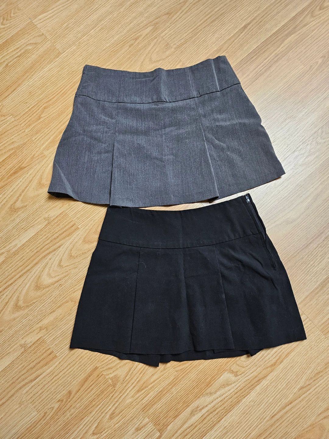 Pair of mini skirts. One grey, one black. Both pleated. Size Small.