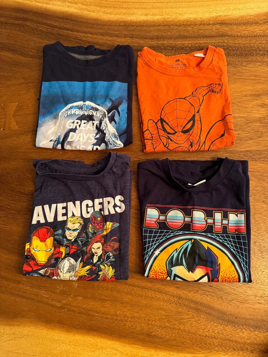 Four boys' short-sleeved t-shirts with various designs. $10 for all.