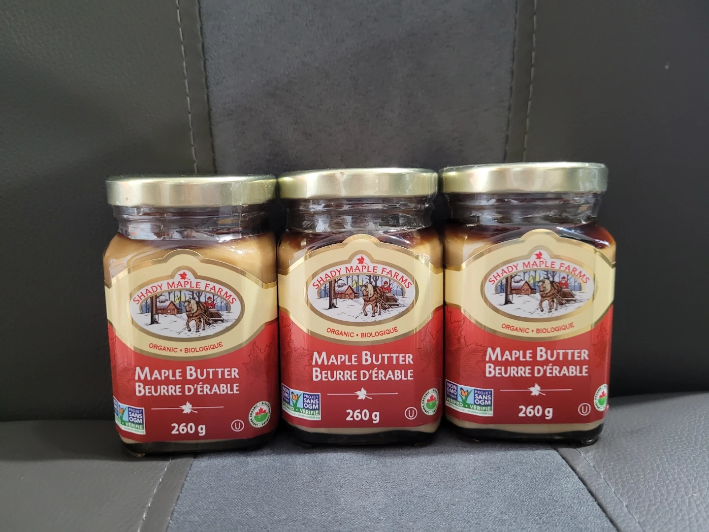 $10 each - Three jars of Shady Maple Farms organic maple butter. Each jar is 260g. This sweet spread is a delicious alternative to jam or peanut butter.