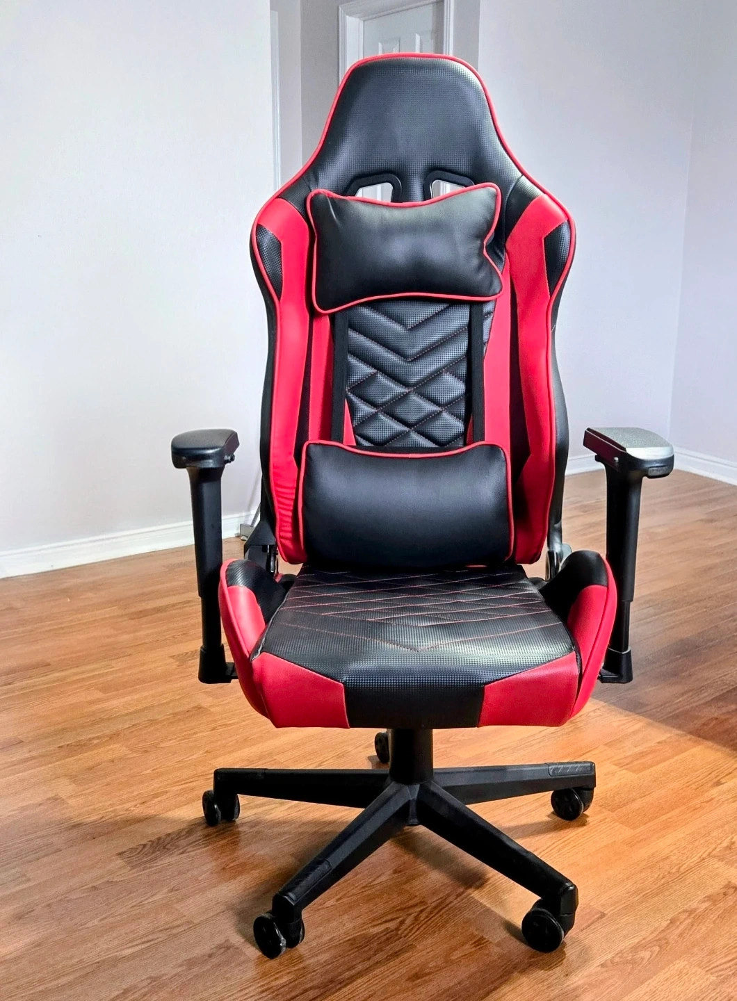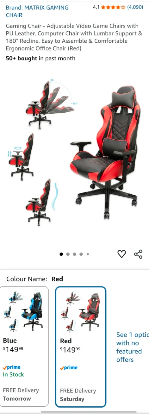 This is a MATRIX brand gaming chair in red and black. It's made with PU leather and includes lumbar support. It's designed for comfort during long gaming sessions.