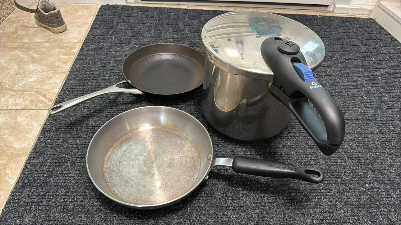 One is a 9.5” buccaneer cast iron skillet by crowdcookware, it has a PTFE nonstick coating that is starting to peel off. It functions well to sear steaks. Great for a DIYer who wants to strip away the PTFE and season it. Handles well with benefits of cast iron with less weight.