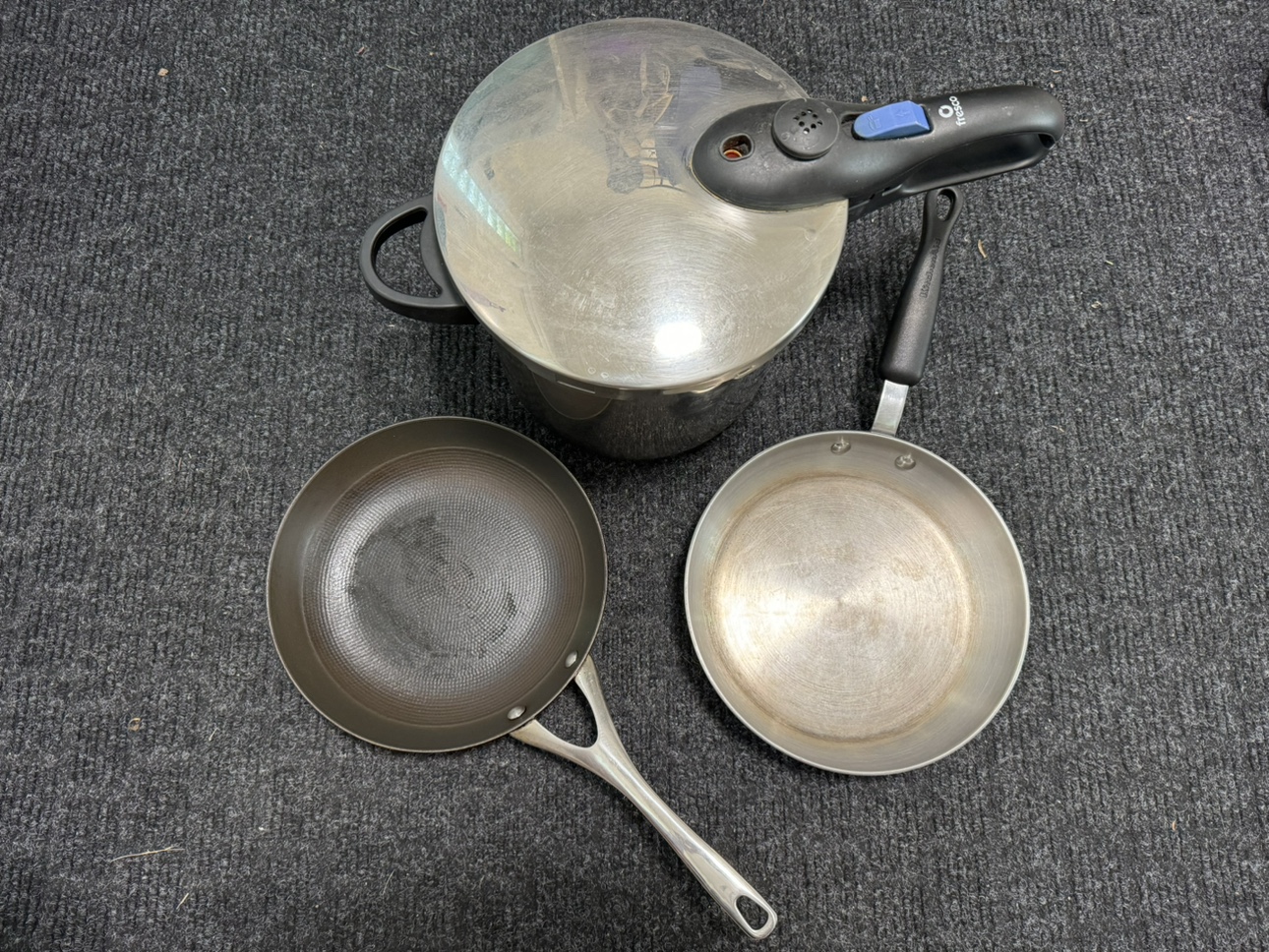 One is a 9.5” buccaneer cast iron skillet by crowdcookware, it has a PTFE nonstick coating that is starting to peel off. It functions well to sear steaks. Great for a DIYer who wants to strip away the PTFE and season it. Handles well with benefits of cast iron with less weight.
