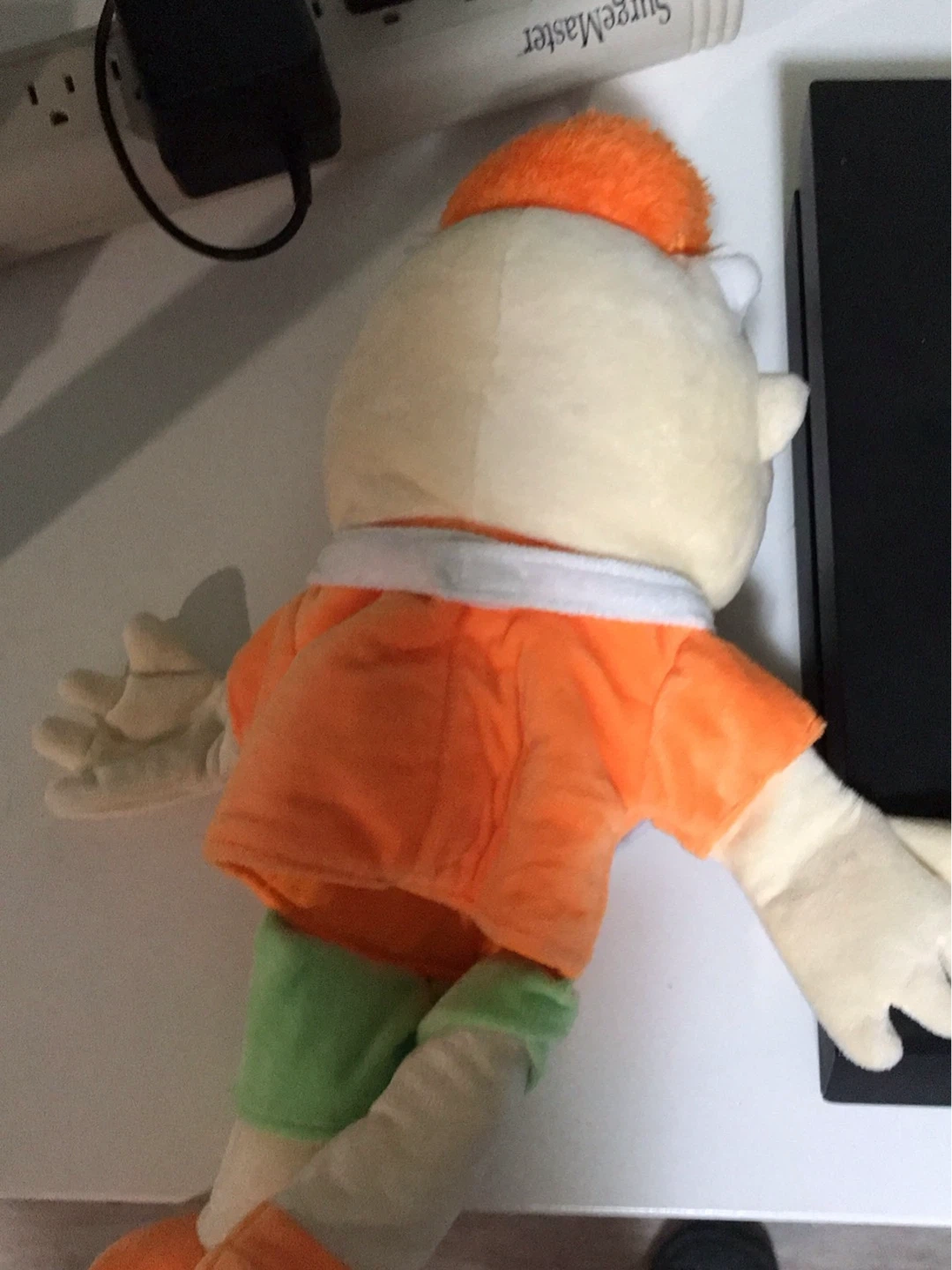 This is a plush puppet toy with 'JP' on its bib. It's dressed in an orange shirt and green shorts. Soft material construction.