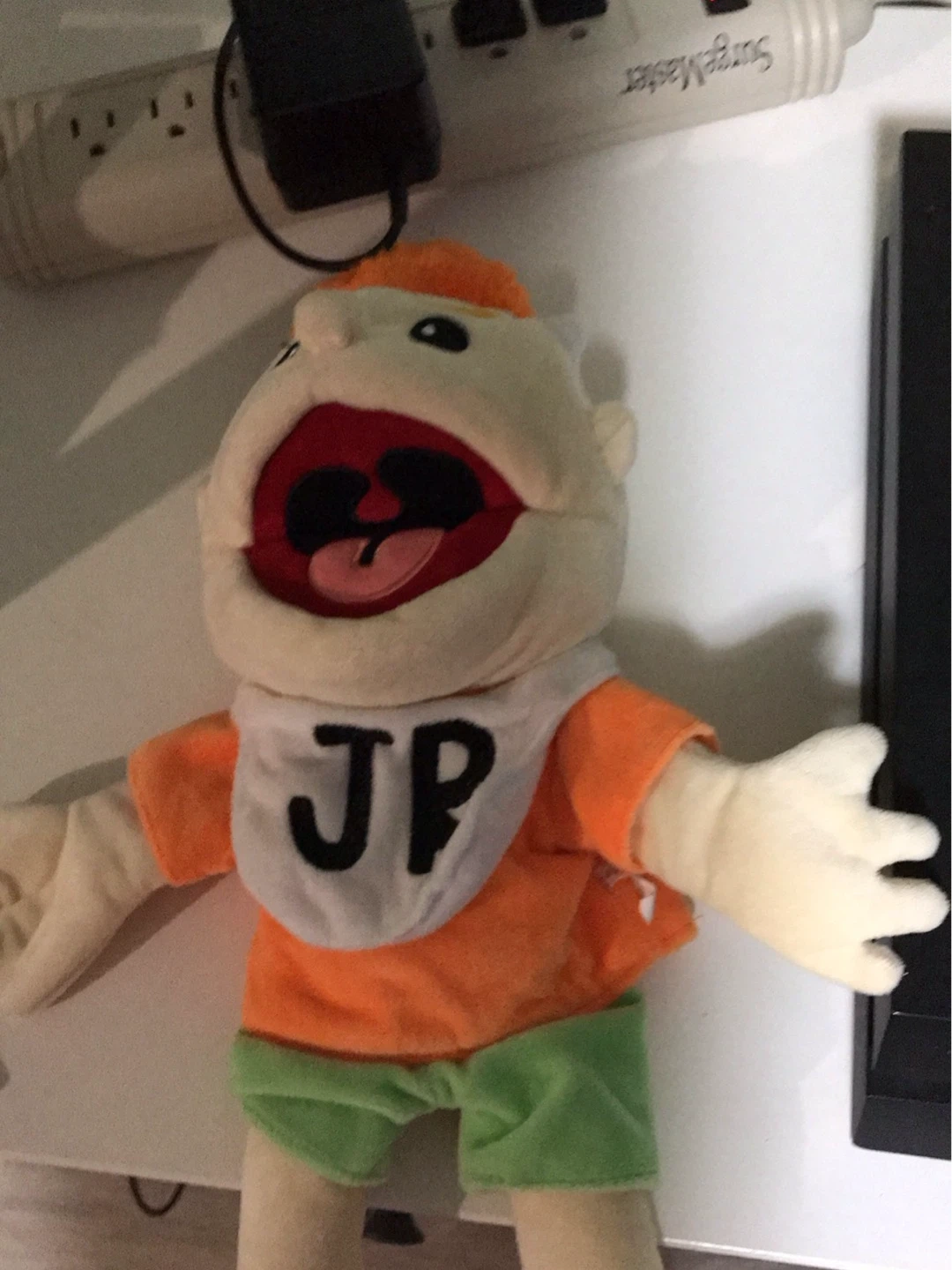 This is a plush puppet toy with 'JP' on its bib. It's dressed in an orange shirt and green shorts. Soft material construction.