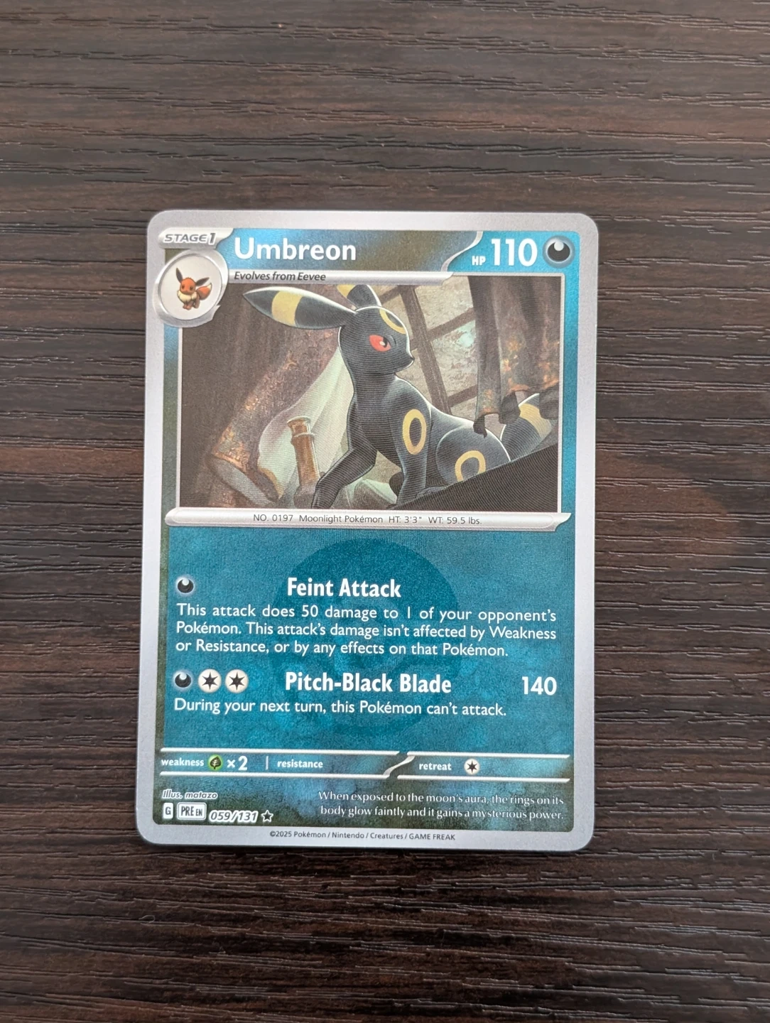 This is a Pokemon Trading Card featuring Umbreon. It's card number 059/131 from Prismatic Evolutions. Masterball edition card