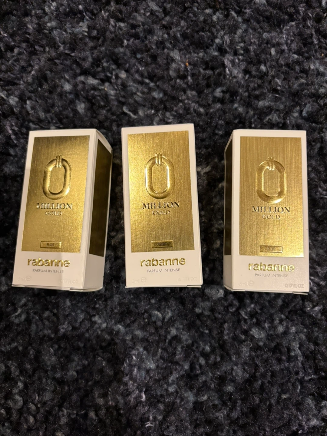 Three miniature bottles of Paco Rabanne 1 Million Gold Parfum Intense. Each bottle contains 5ml of perfume. A great way to try out this scent!