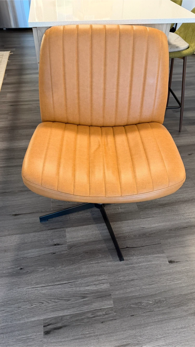 This office chair features a tan faux leather upholstery with a channel-tufted design. It has a black metal base with a swivel function. It's a comfortable accent chair for your home office!