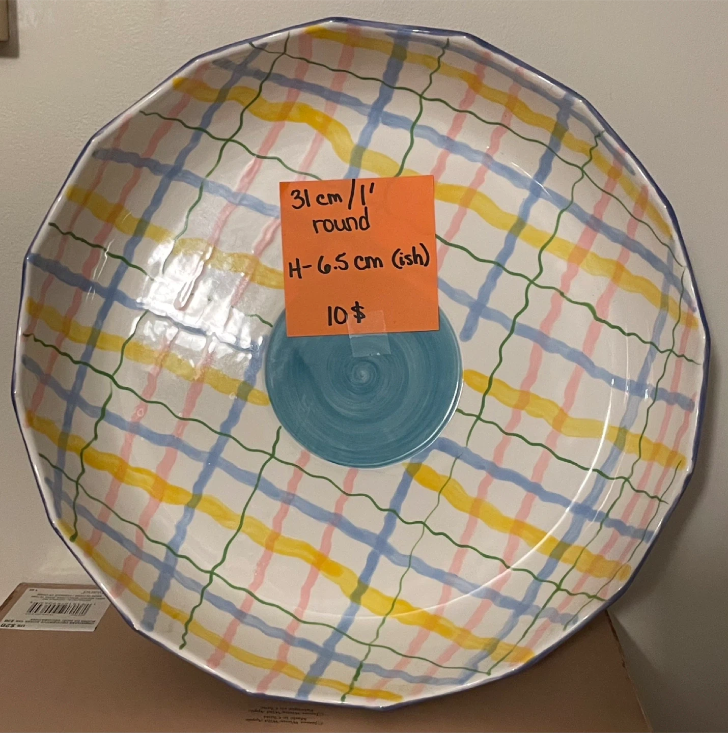 This is a large, round serving bowl with a colourful plaid pattern. It's 31 cm in diameter and approximately 6.5 cm high. It's a nice bowl for serving food!