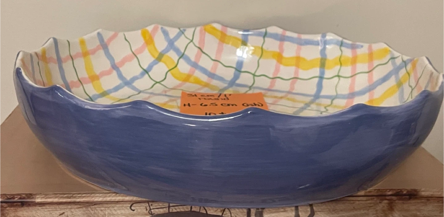 This is a large, round serving bowl with a colourful plaid pattern. It's 31 cm in diameter and approximately 6.5 cm high. It's a nice bowl for serving food!