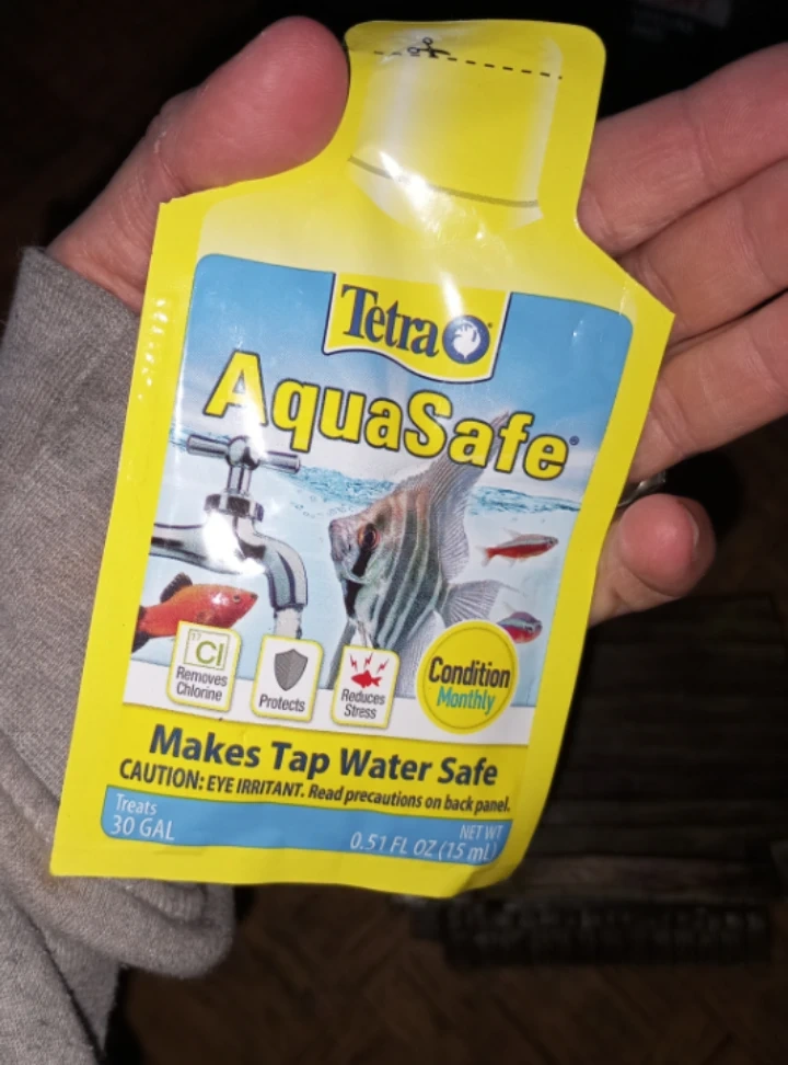 It treats up to 30 gallons of tap water, removing chlorine and protecting fish.