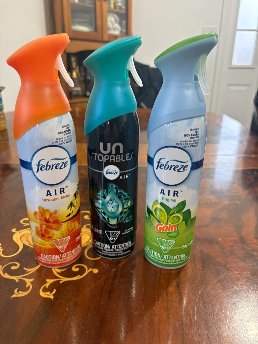 Three air freshener sprays: Febreze Hawaiian Aloha, Febreze Original Gain scent, and Unstopables Fresh Air. Each can contains 250g (8.8 oz) and uses 100% natural propellant. They're designed to eliminate odours.