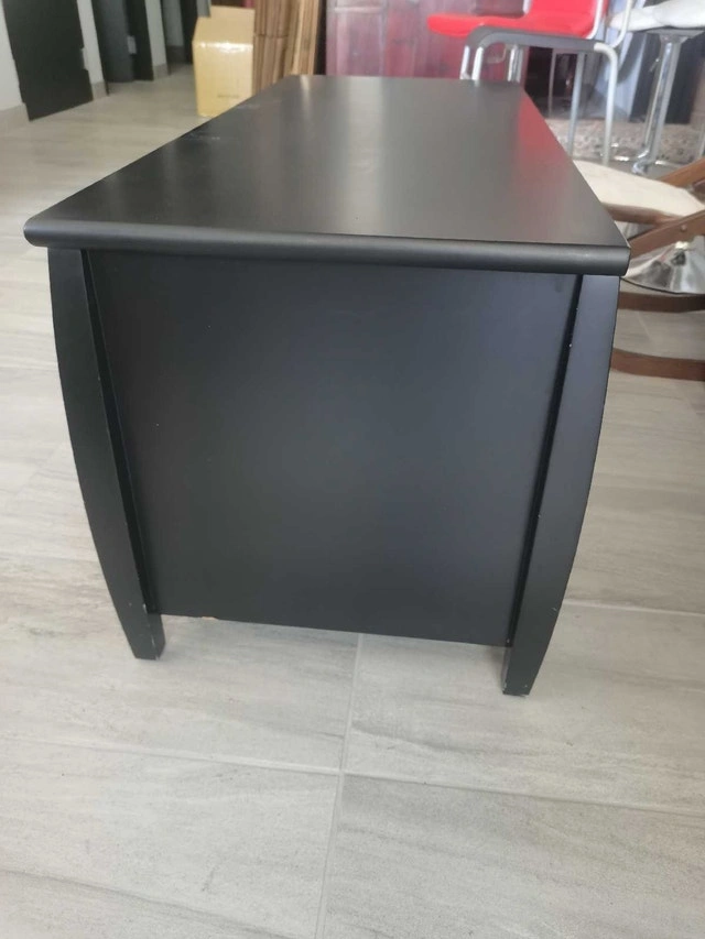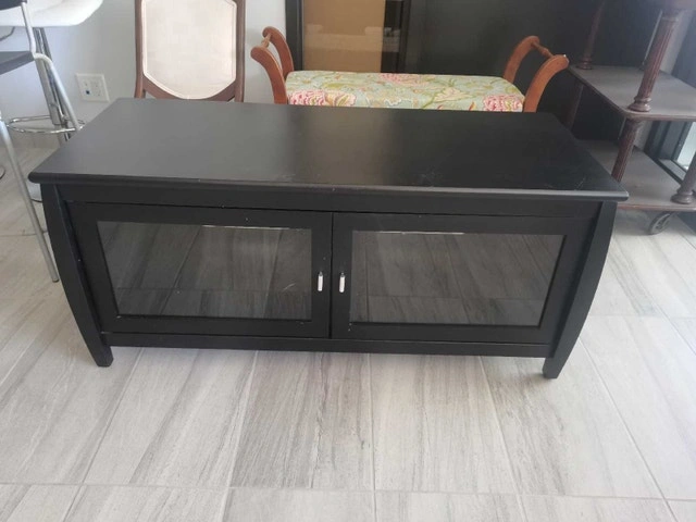 This is a sturdy black TV stand that is in good condition, perfect for any living room setup. The stand features a sleek design with glass-paneled doors and ample storage space inside for your media devices. It is a previously owned item, so it has some wear and tear.