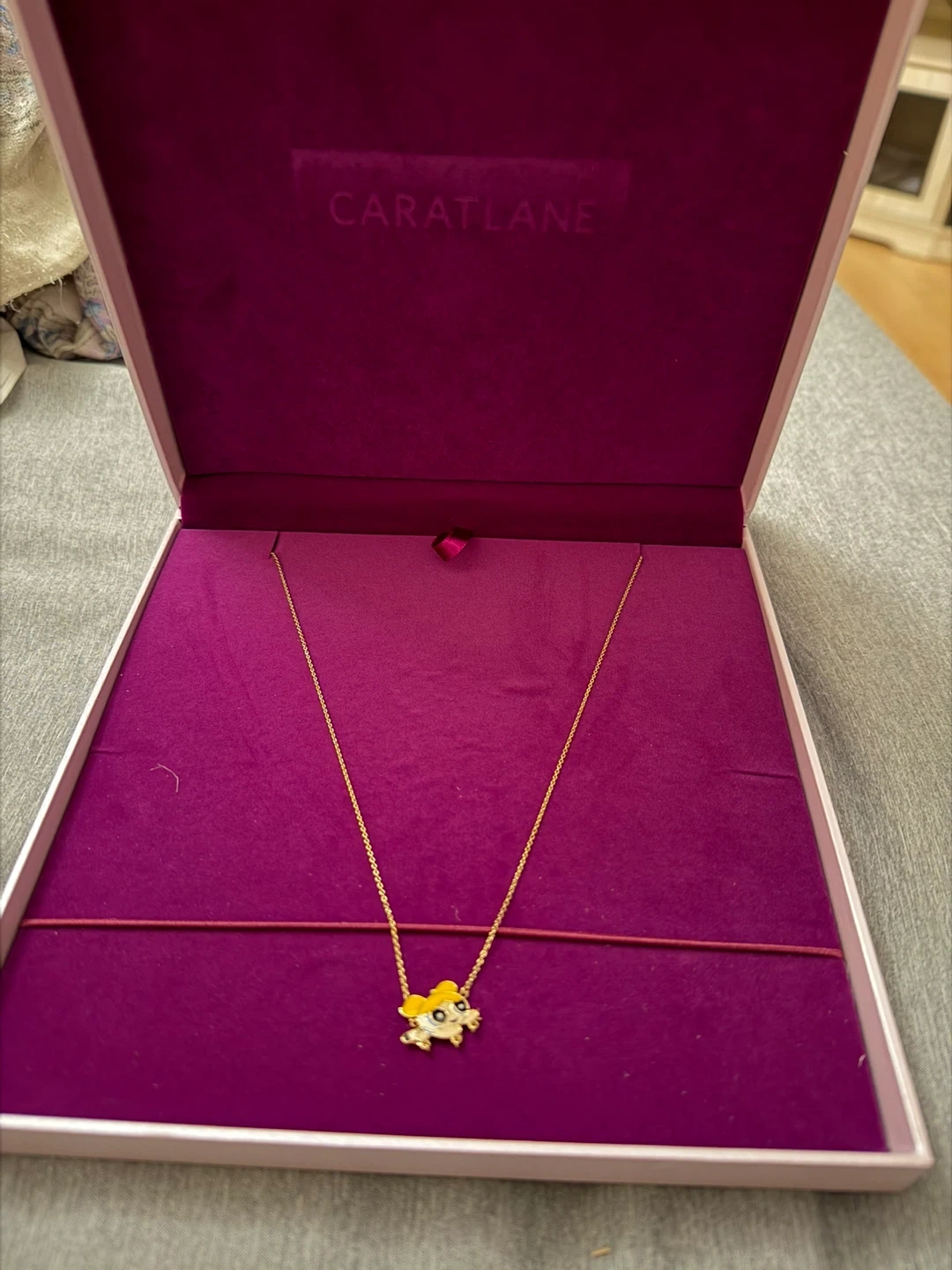 This is a gold necklace from Caratlane. It comes with a cute charm. The necklace is presented in its original box.
