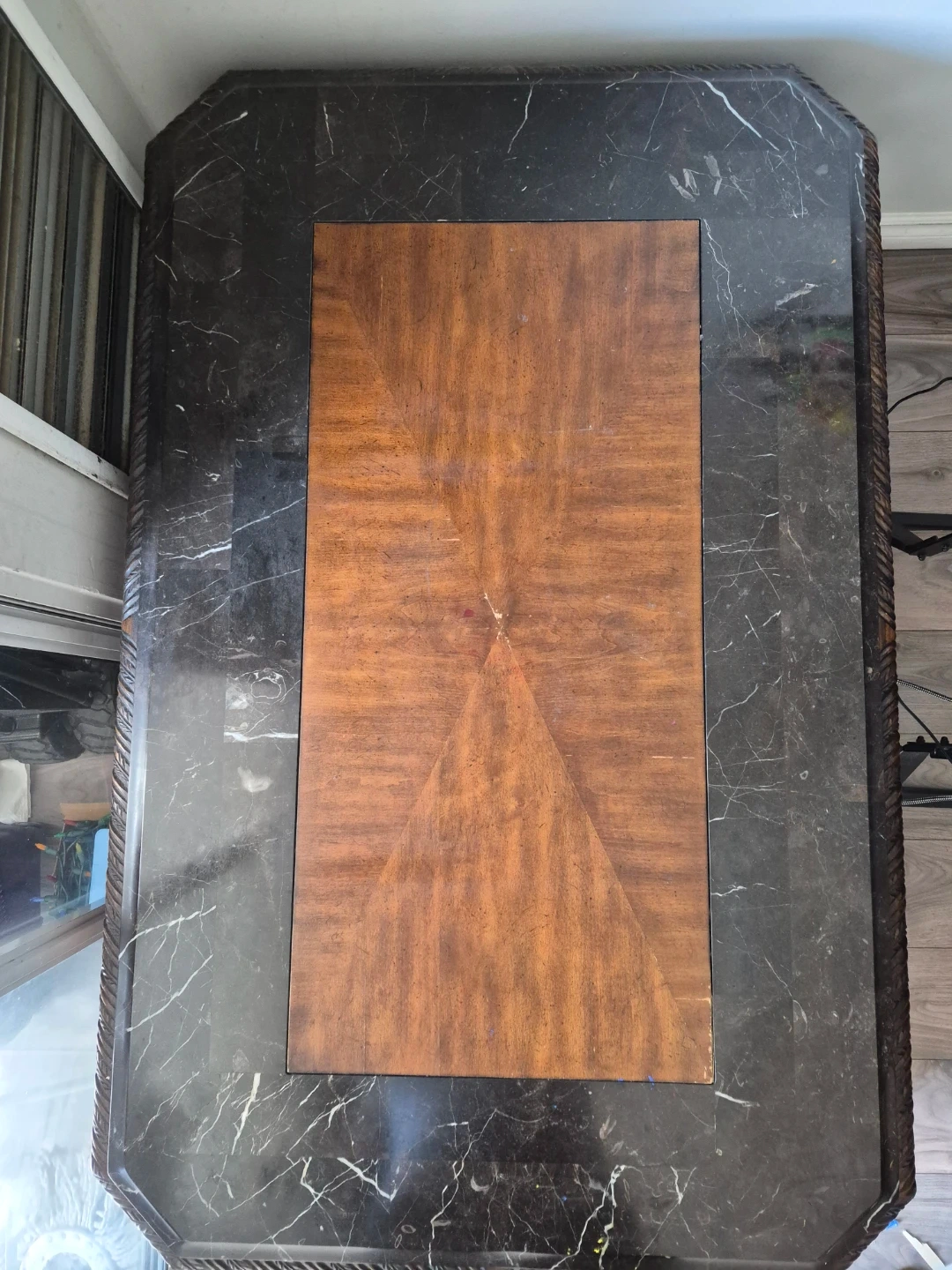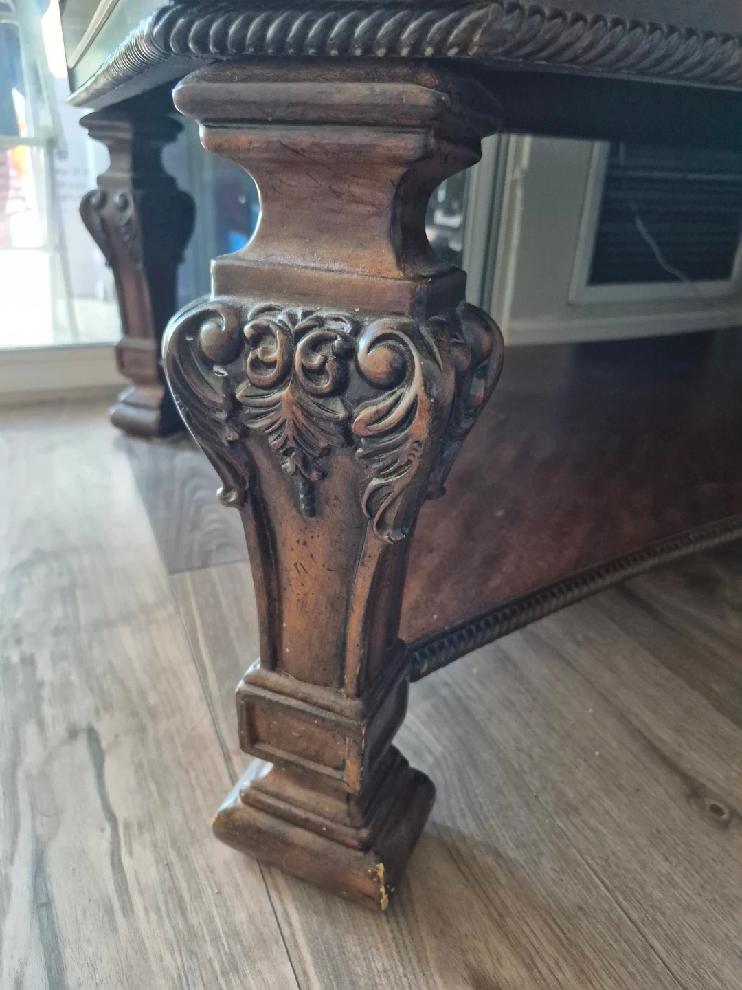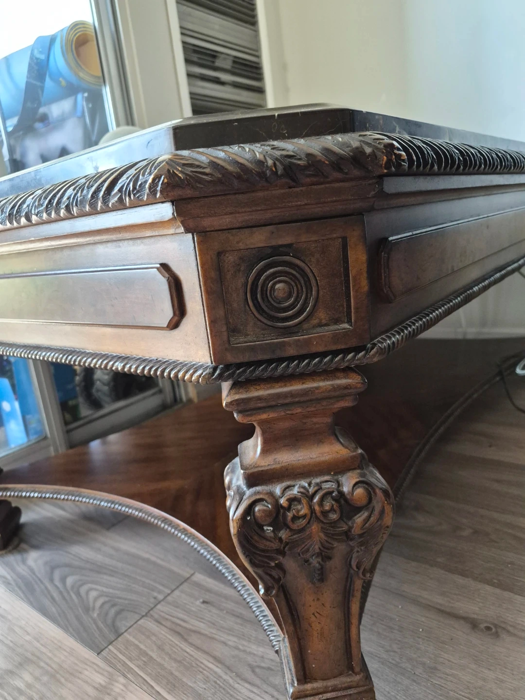 Sturdy coffee table has dark marble outer rim with polished wood center inlay. Frame is solid wood with detailed ornate carvings on legs and side panels. Lower shelf provides extra storage space. Piece has dark brown finish and traditional aesthetic.