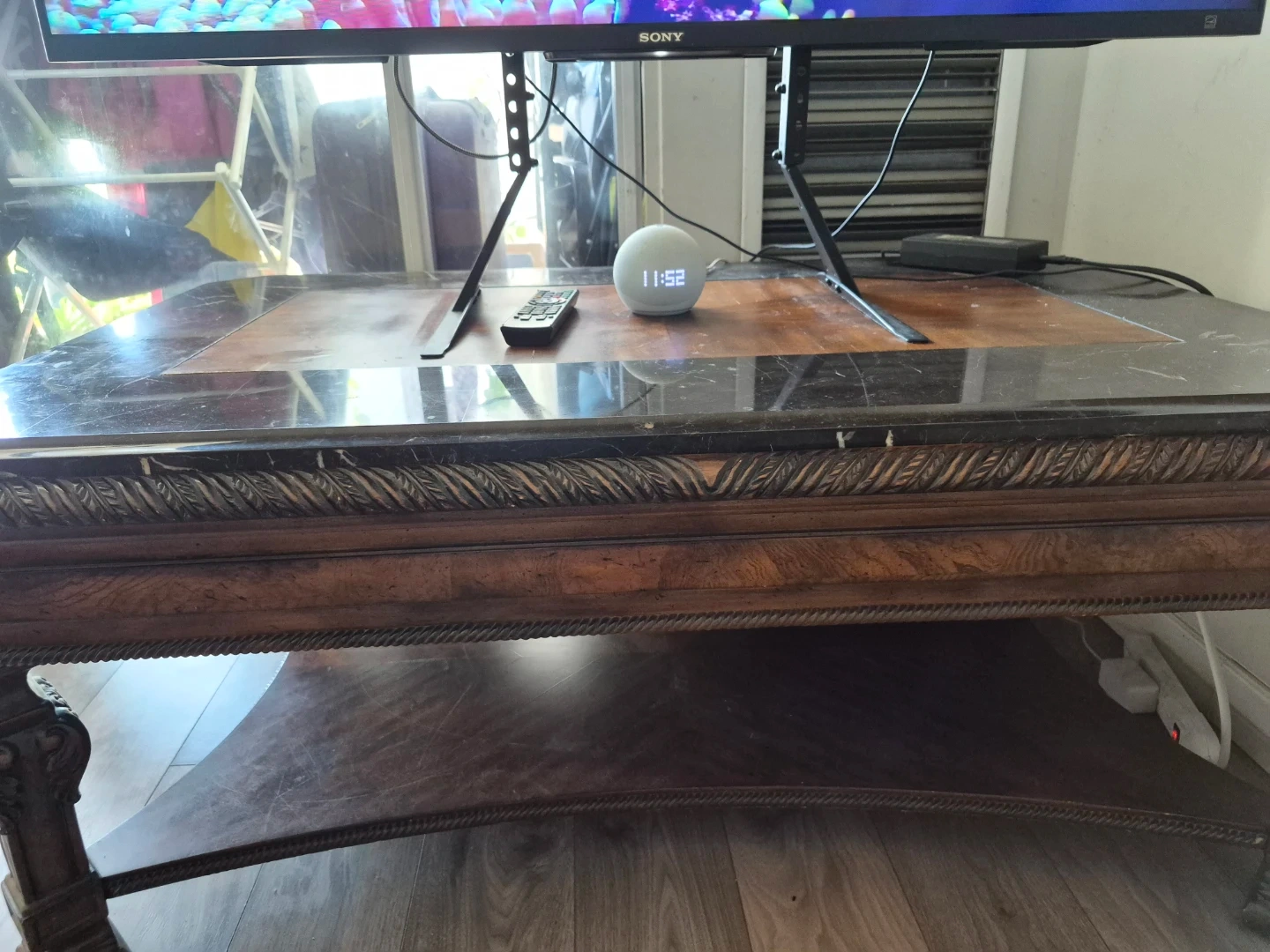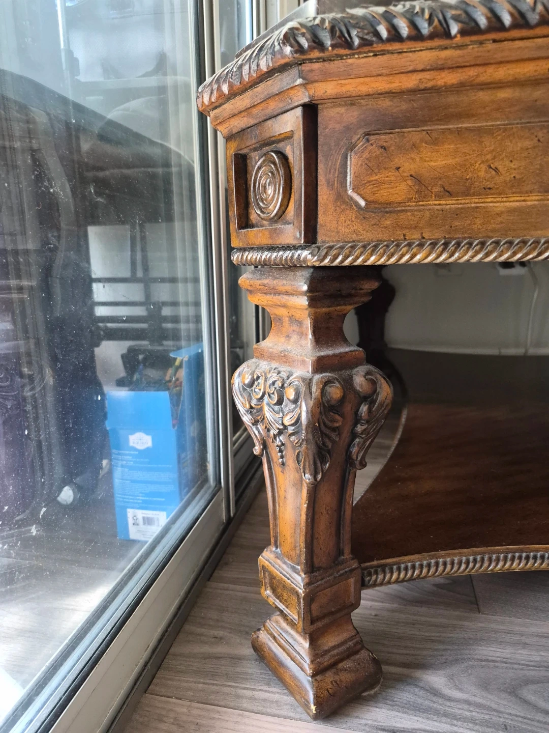 Sturdy coffee table has dark marble outer rim with polished wood center inlay. Frame is solid wood with detailed ornate carvings on legs and side panels. Lower shelf provides extra storage space. Piece has dark brown finish and traditional aesthetic.