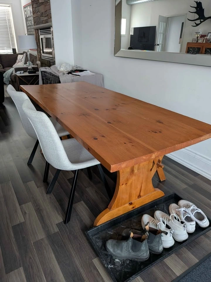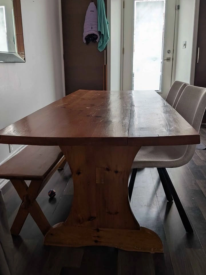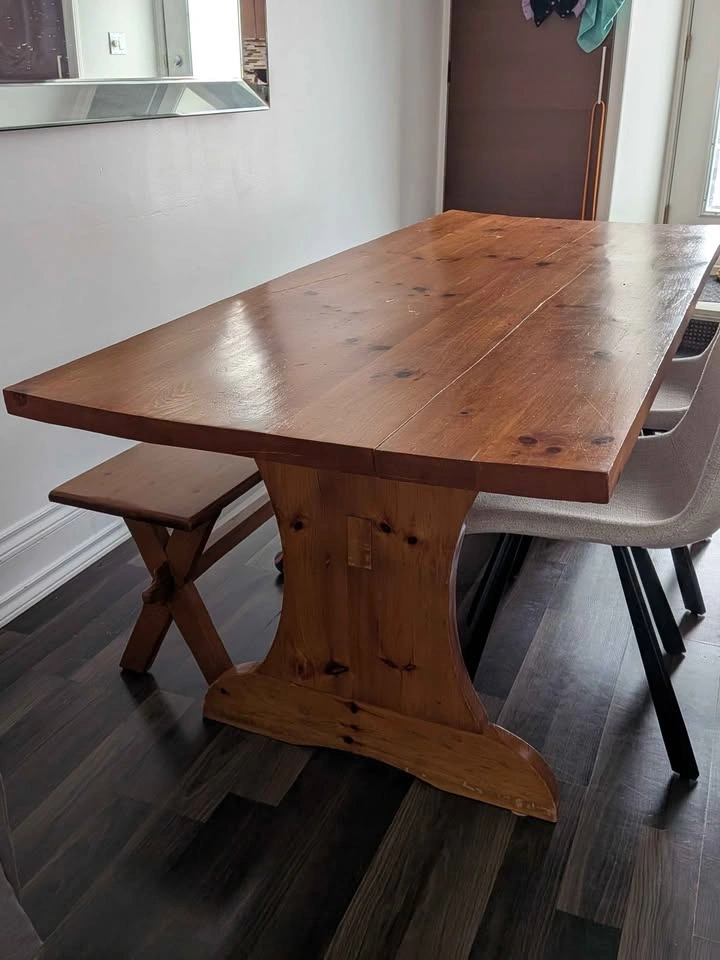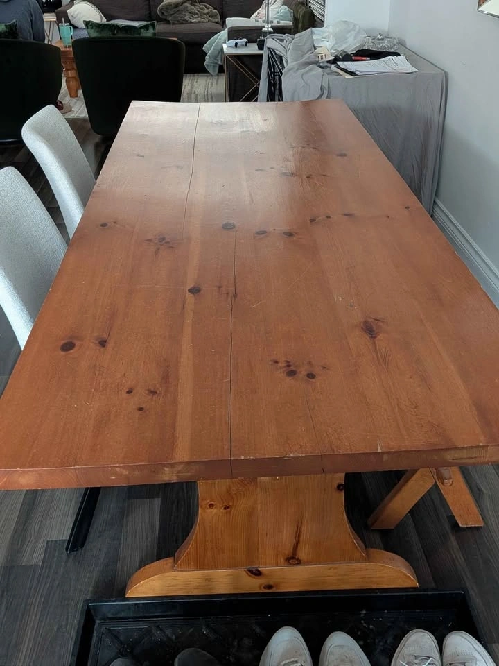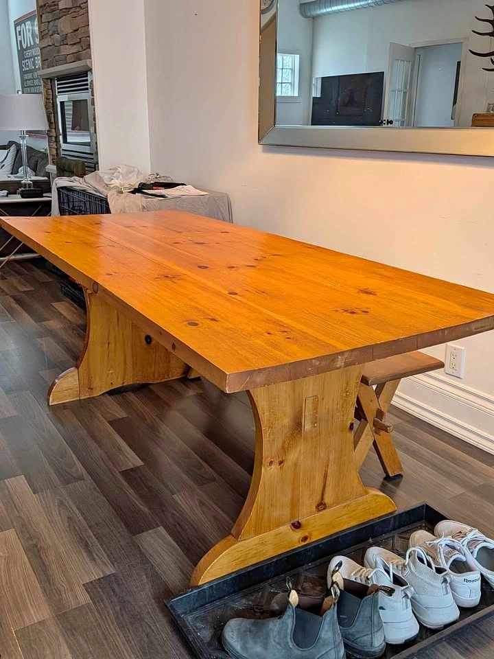 Wooden farmhouse dining table. 32 1/2 in wide, 78 inches long. Bit warped, needs some TLC. Would make a great addition to the cabin, cottage, or vintage store for merchandise.
