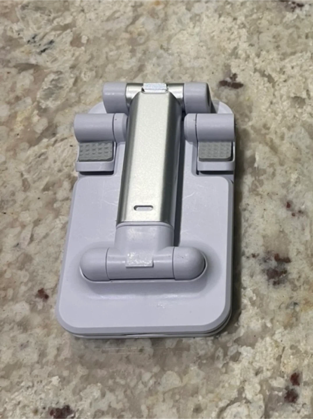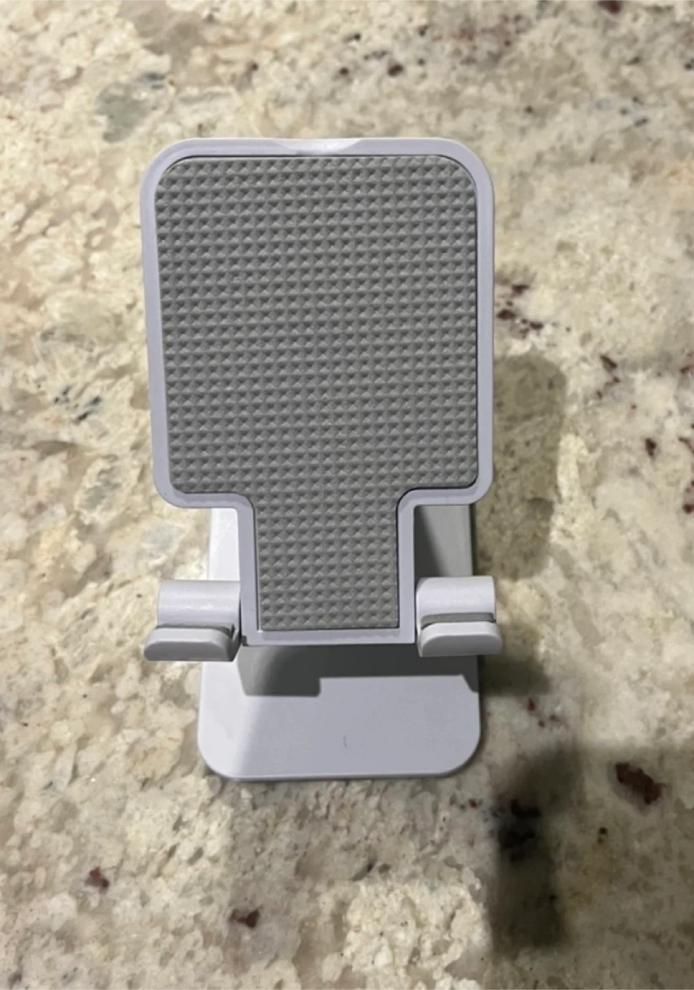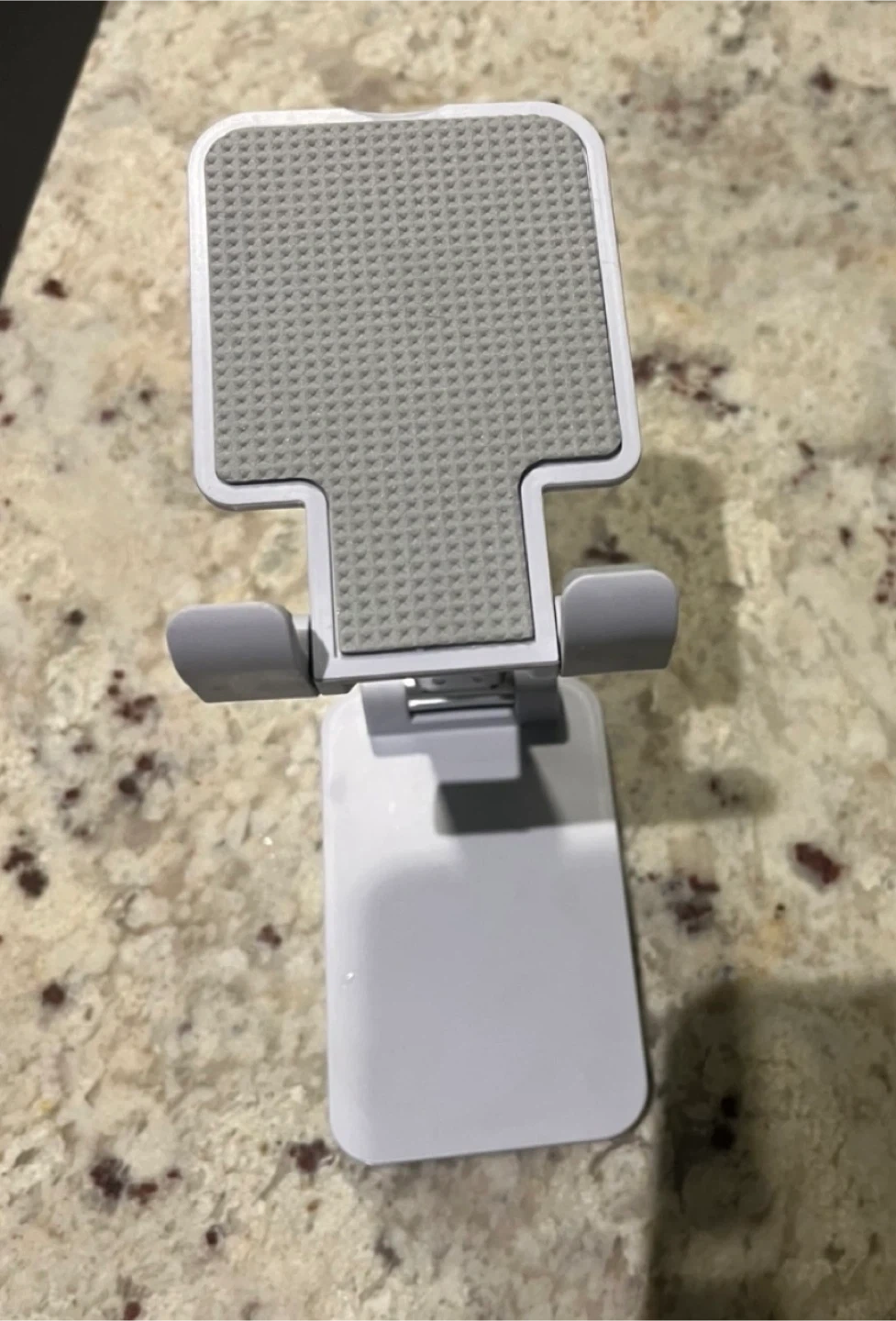 This is a white adjustable foldable phone stand. It's made of durable plastic and metal. The stand can hold all smartphones. Excellent condition, like new. Rarely used. From smoke-free, pest-free, and pet-free home.
