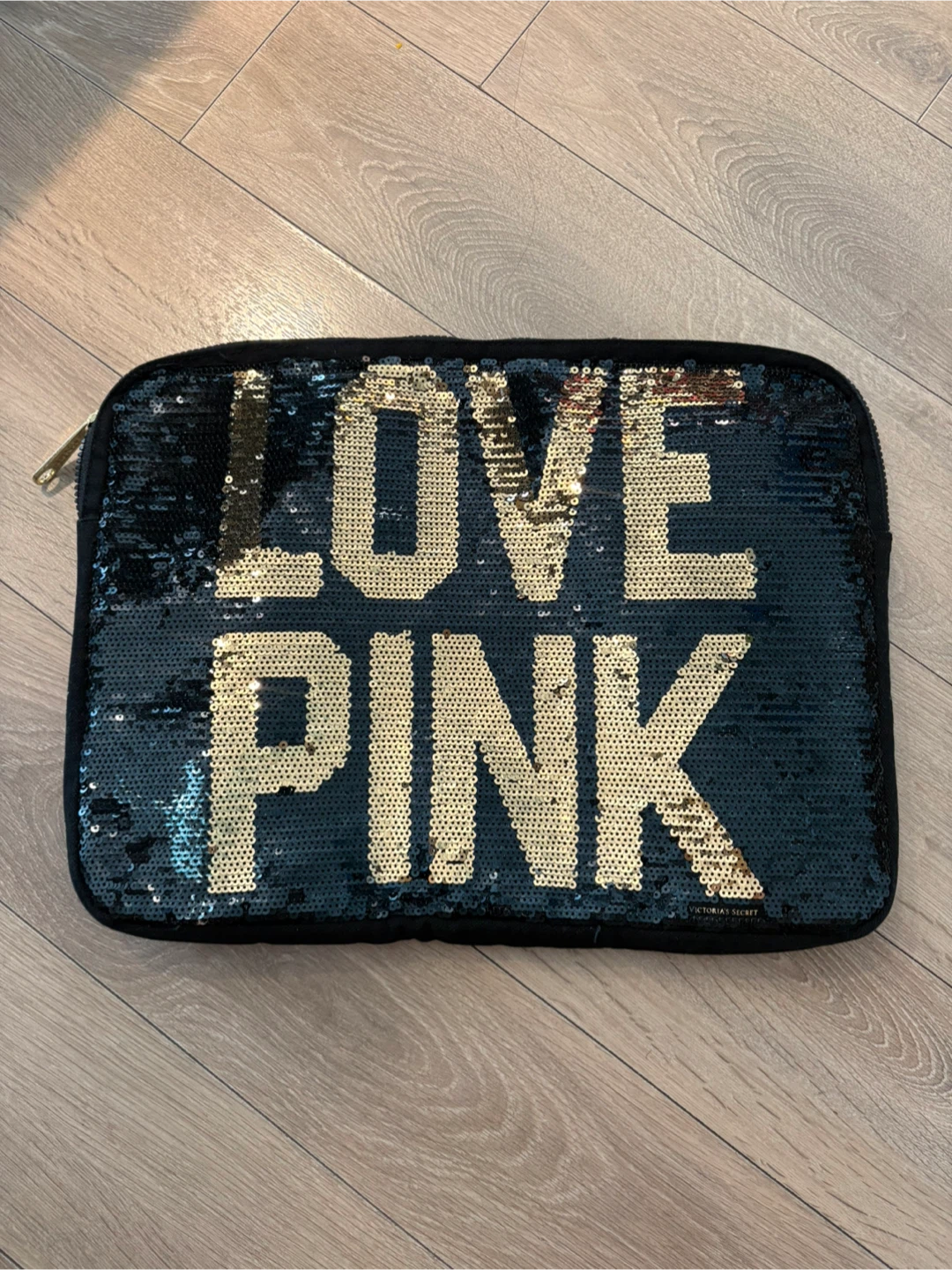 This Victoria's Secret PINK "LOVE PINK" laptop sleeve features a black exterior with shimmering gold sequins forming the "LOVE PINK" graphic. It's designed to protect your laptop with a zippered closure. Made of durable material. 11x15”