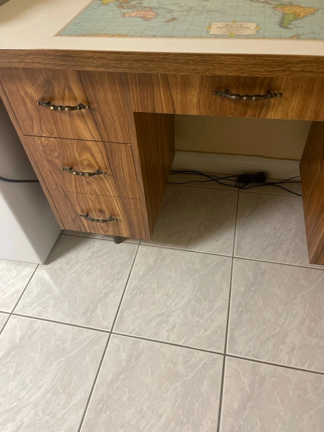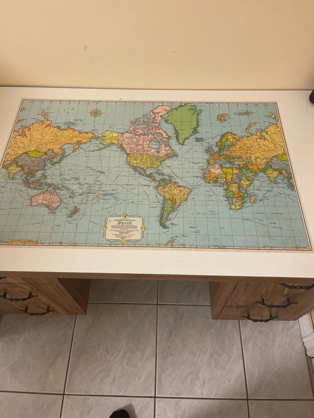 This used desk features a unique world map inlay on its surface, making it a functional and decorative piece. It is used, but still in good condition. It includes drawers on either side offering great storage! I estimate the value to be $150 based on Kijiji pricing of similar items. If the ad is up, it is available! Perfect for a student or anyone who appreciates craftsmanship. Cash accepted.