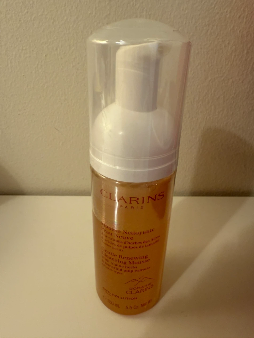 Selling a Clarins Gentle Renewing Cleansing Mousse! It's designed with Alpine herbs and tamarind pulp extracts, suitable for all skin types. This anti-pollution mousse comes in a 150 mL (5.5 Oz) bottle, perfect for your skincare routine