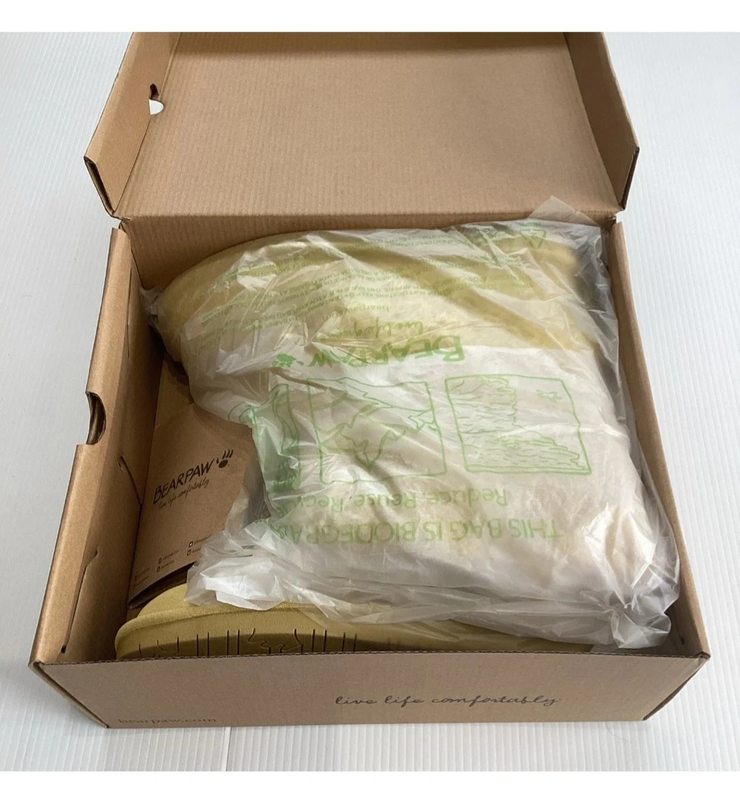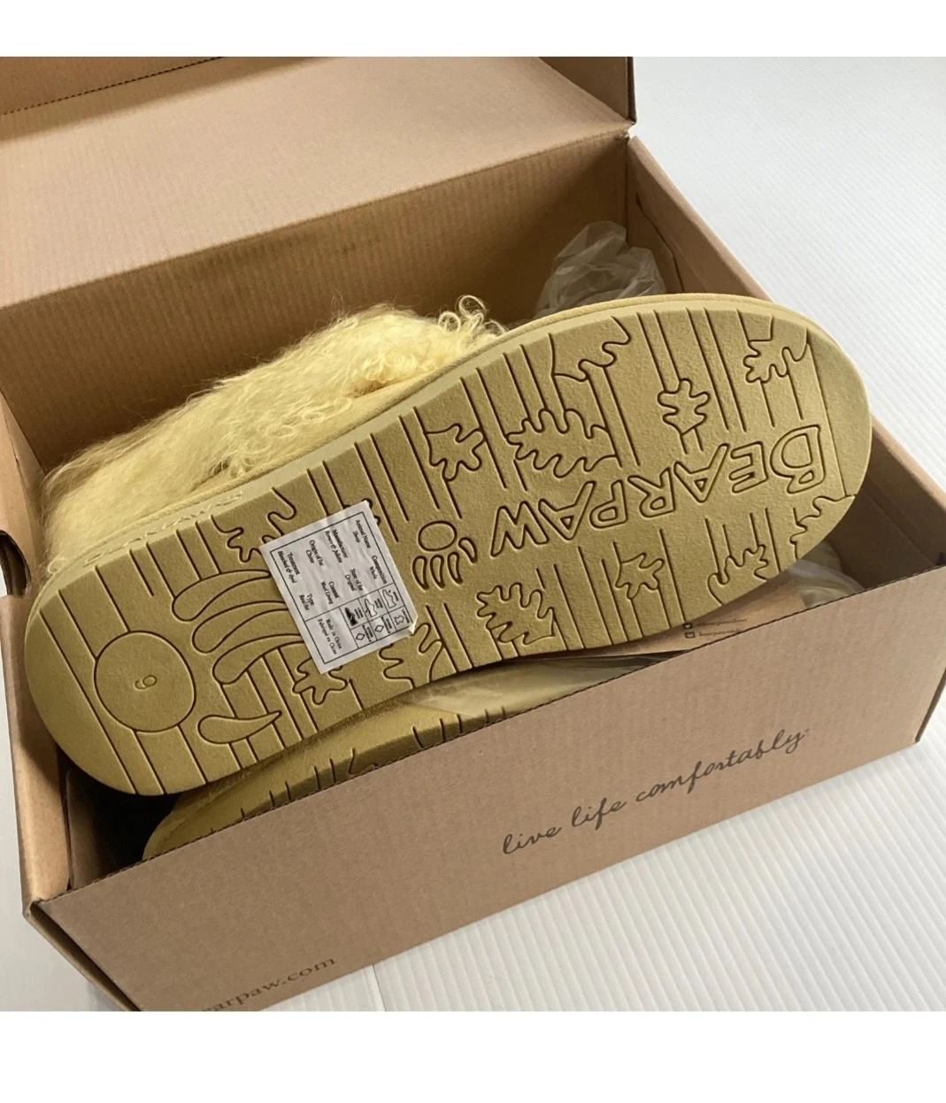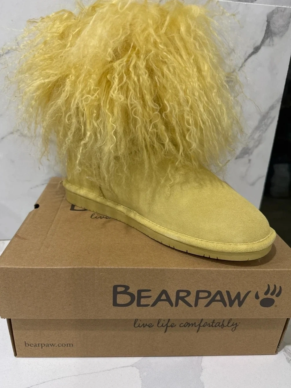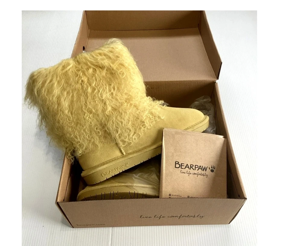 These BearPaw boots come in a bright yellow colour. They feature fluffy detailing around the top. The original box is included with the purchase.