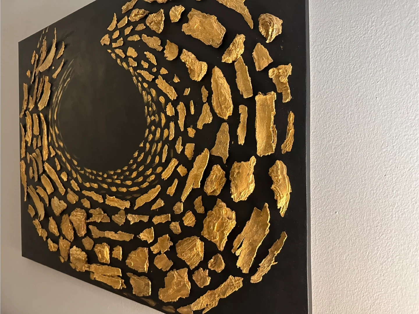 Unique piece of wall art featuring an abstract design in gold on a black background. Adds a modern and stylish touch to any room!