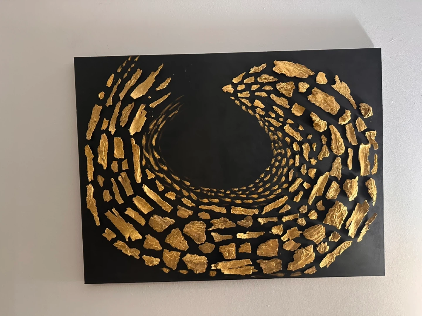 Unique piece of wall art featuring an abstract design in gold on a black background. Adds a modern and stylish touch to any room!