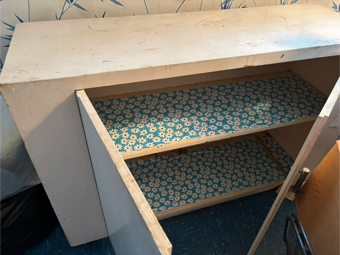 This is a vintage storage cabinet with two doors and two shelves inside. The shelves are lined with a floral pattern. It's a sturdy, wood piece that would be useful for general storage. Dimensions are 16”w x 49”l x 33”h