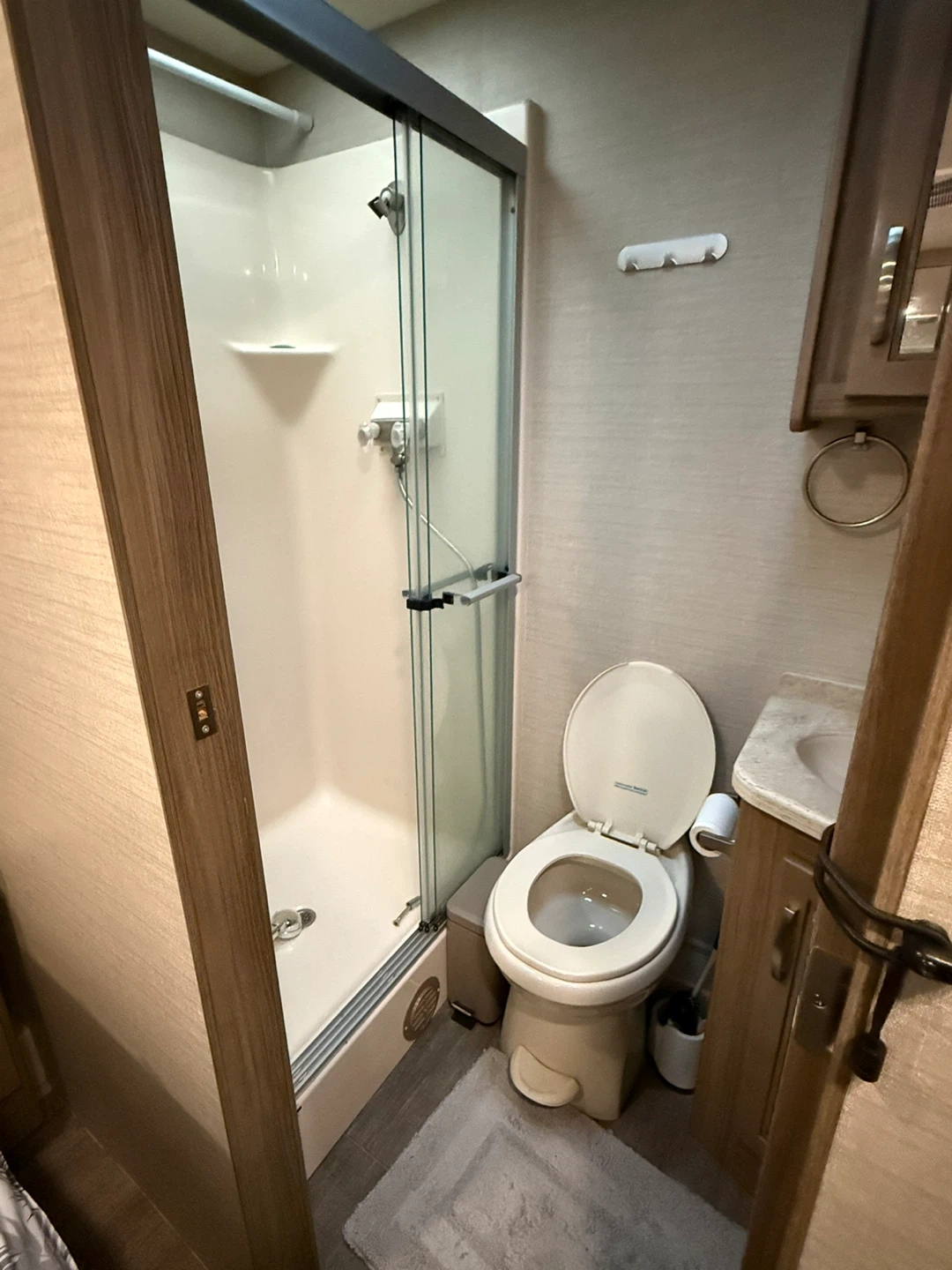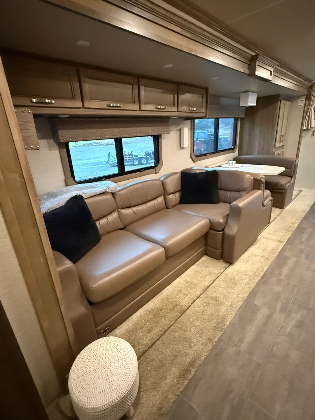 2018 Jayco Seneca 37K Super C diesel motorhome built on a Freightliner S2RV chassis, 39000 miles , featuring a 360 HP Cummins 6.7L engine, Allison transmission, and sleeps up to 8 people with two bathrooms, offering residential amenities like a full kitchen, entertainment systems, fireplace and a king bed in the master suite, alongside standard features like auto-leveling jacks, dual ACs, and ample storage, perfect for families.