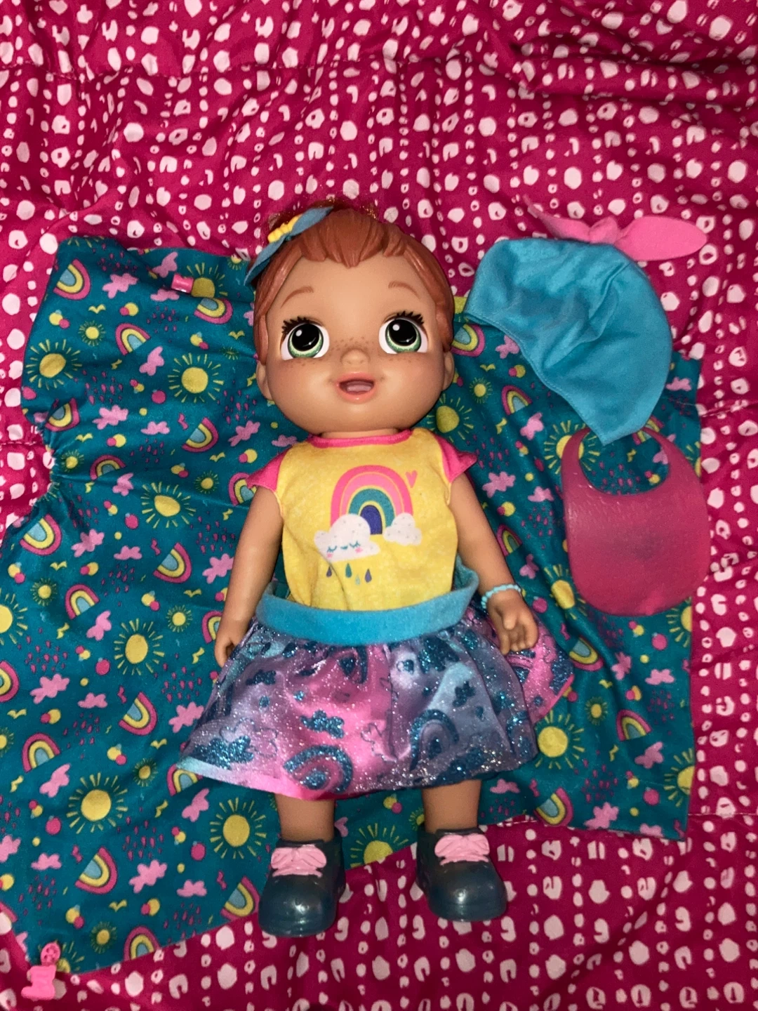 This Baby Alive doll has a colourful outfit. It comes with a blue toque and a pink bib with a baby swaddle. The doll has a switch on its back for sound features. Hair grows and grows when taken fed and played with.
