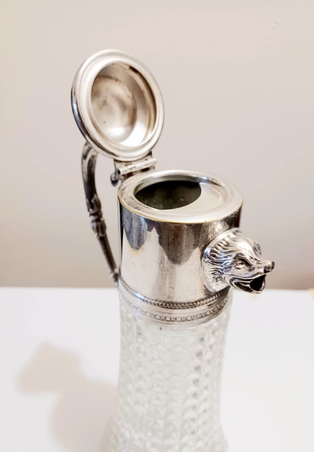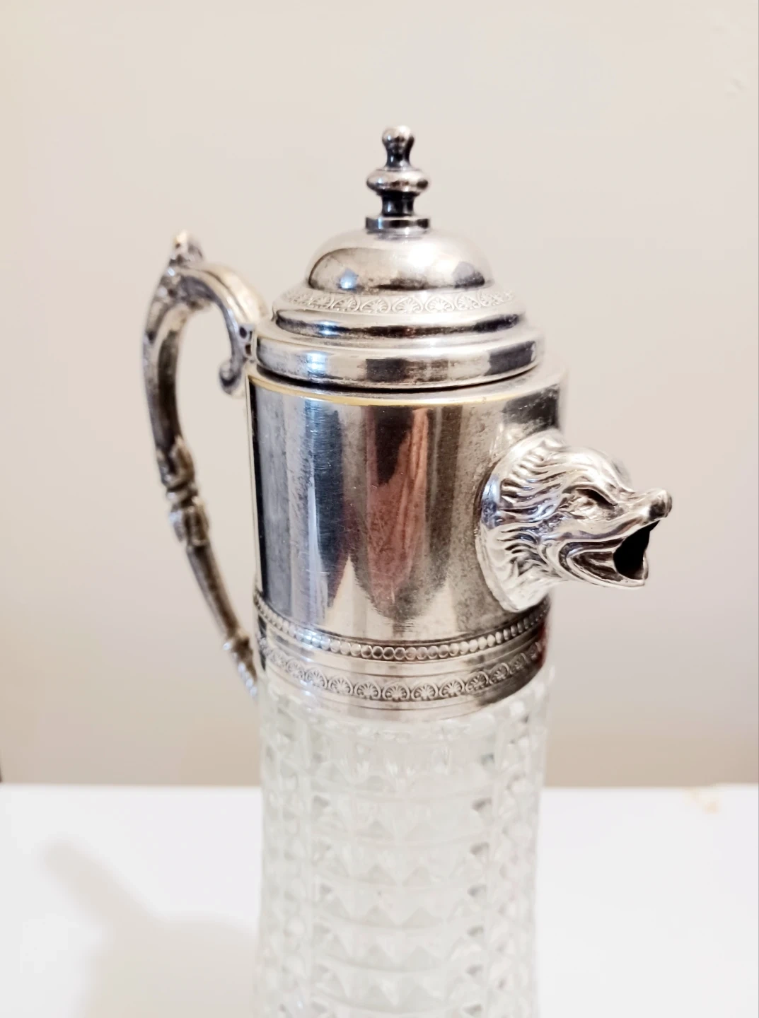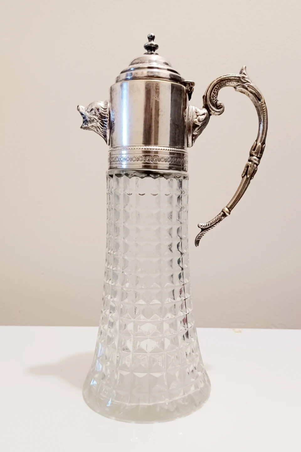 Antique, Stunning Claret Jug, originating from Italy during the 1880s, featuring a crystal body and silver-plated mounts, adorned with intricate decorative and Hand Cut Diamond Point Crystal Glass ArtvDecanter . Silver-plated top, lid, and decorative handle.