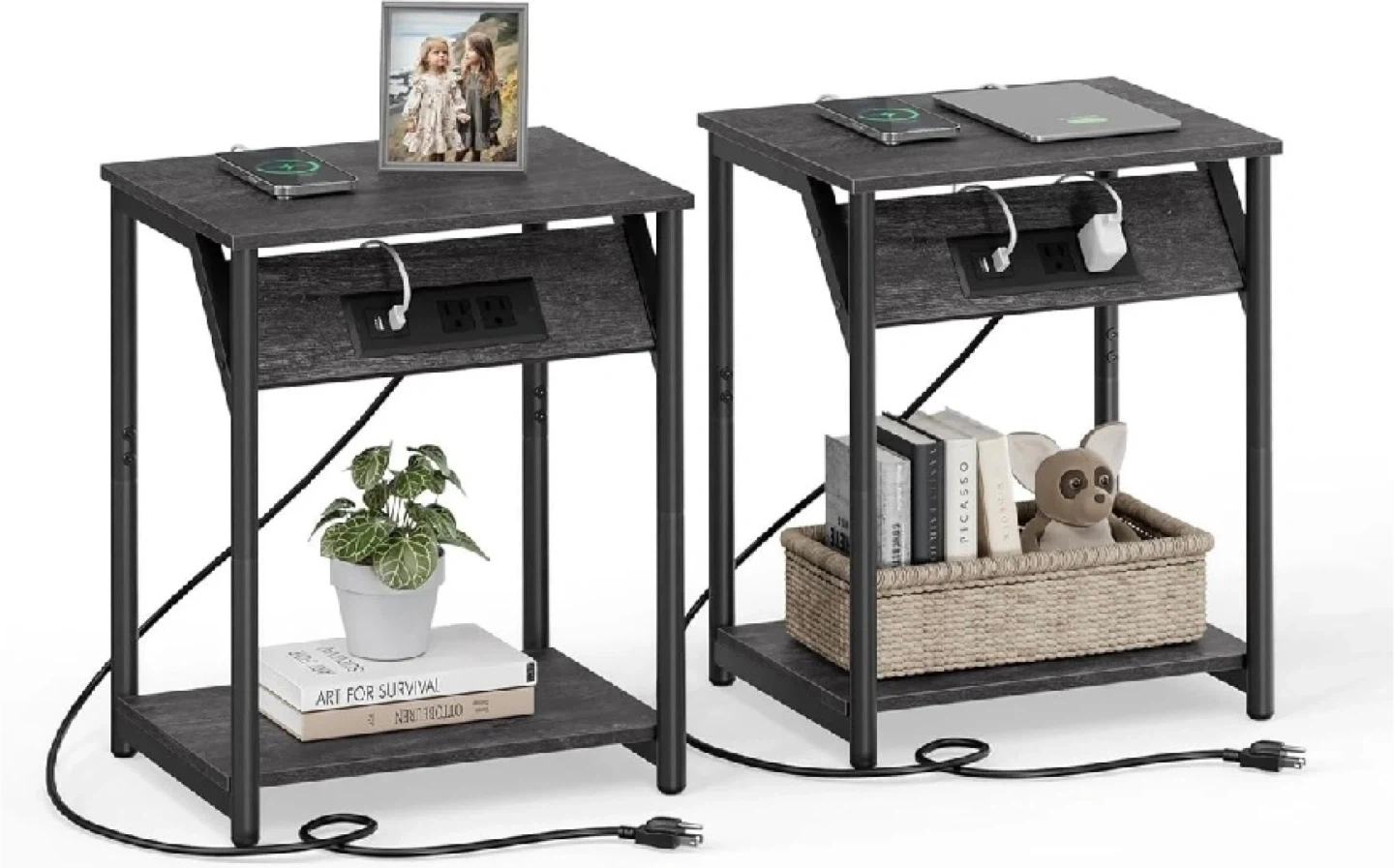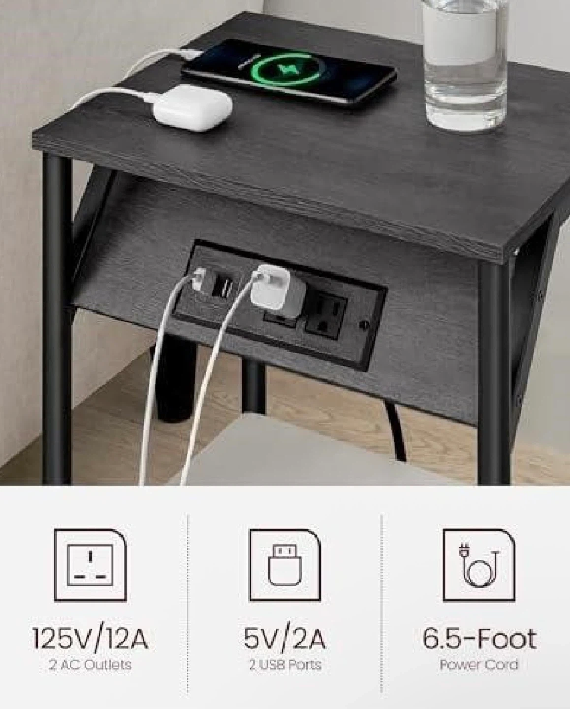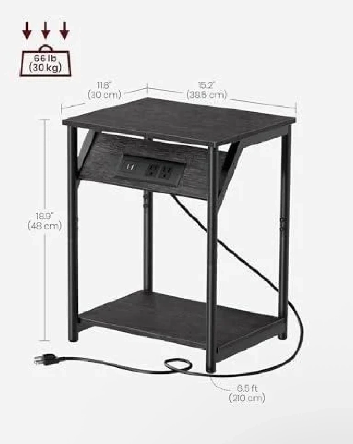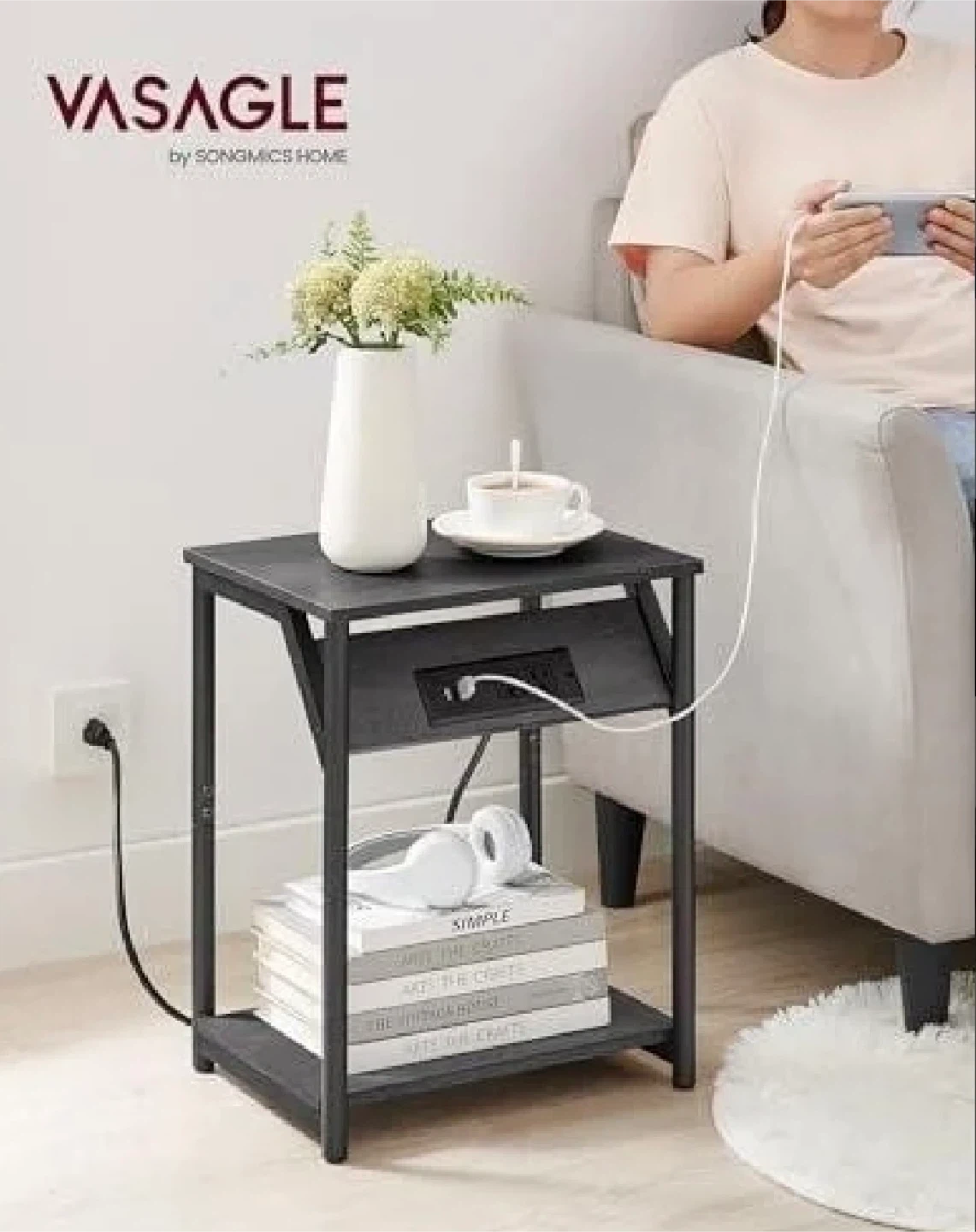 VASAGLE by Songmics Home end table with a built-in charging station. It features 2 AC outlets and 2 USB ports. The table is 18.9 inches high and made of dark wood-look material with a black metal frame. Its compact design makes it handy for beside a sofa or bed.